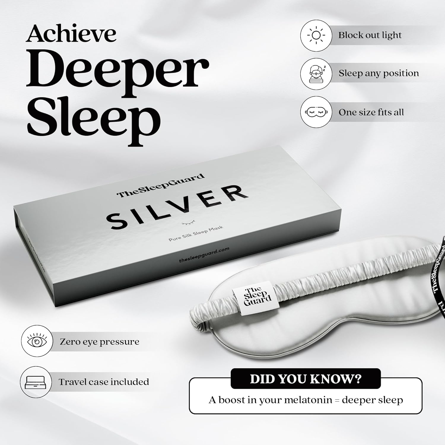 - 🔆 BLOCK OUT LIGHT - Achieve a deeper sleep with our pure silk sleep mask. An eye cover will help you get a better night’s sleep by falling asleep faster and staying asleep longer thanks to a boost in melatonin production.