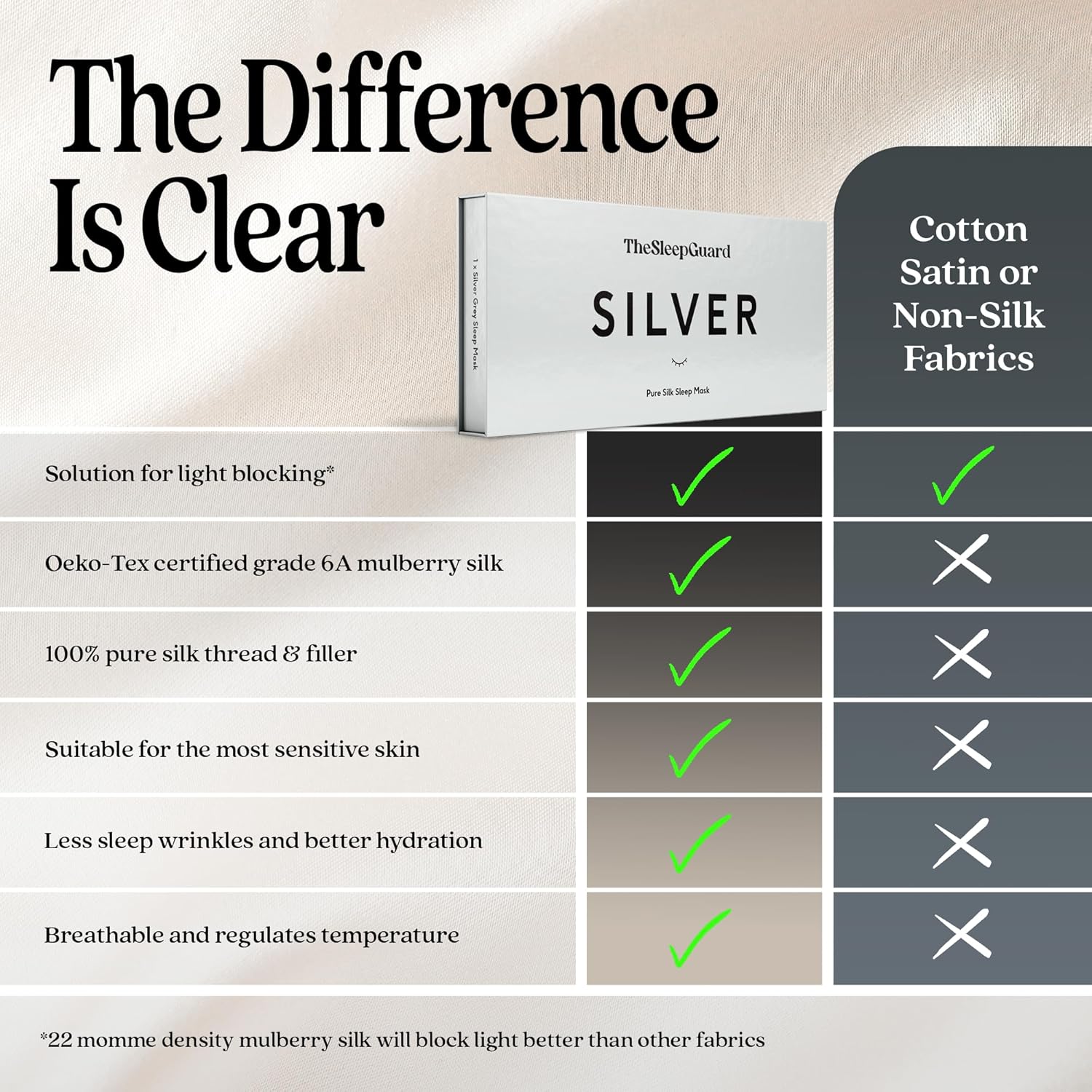 - ✅ INVEST IN YOUR SLEEP - Experience TheSleepGuard difference with our luxury sleeping masks. Crafted from the highest grade 6A Mulberry silk at 22 momme and certified by Oeko-Tex to ensure you sleep soundly. Remember, better sleep leads to a better you.