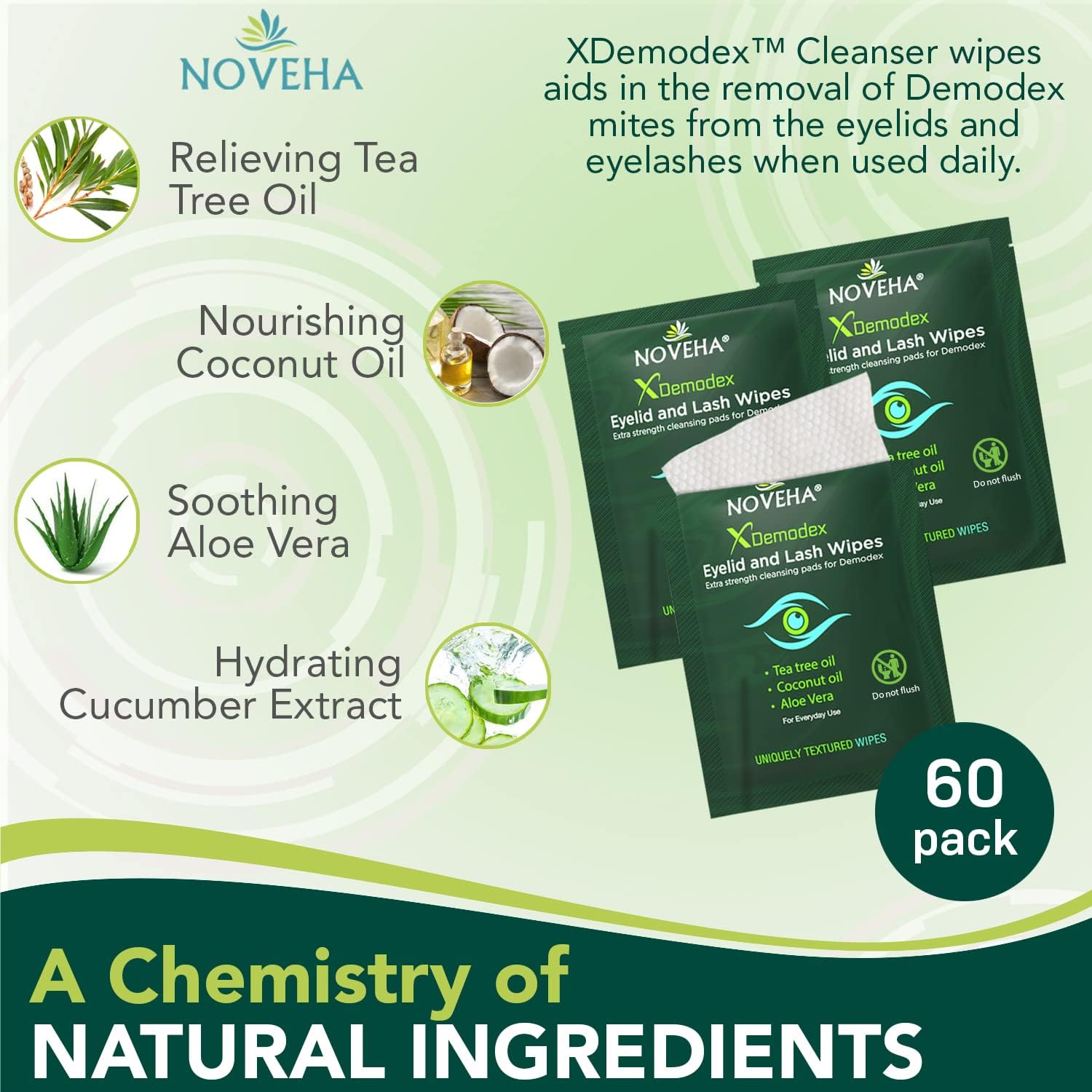 NOVEHA Demodex Eyelid & Lash Wipes | Box of 60 Individually Wrapped Extra Strength Cleansing Eyelash Wipes - Battles Irritated Eyes - Naturally Remove Debris (Pack of 2)