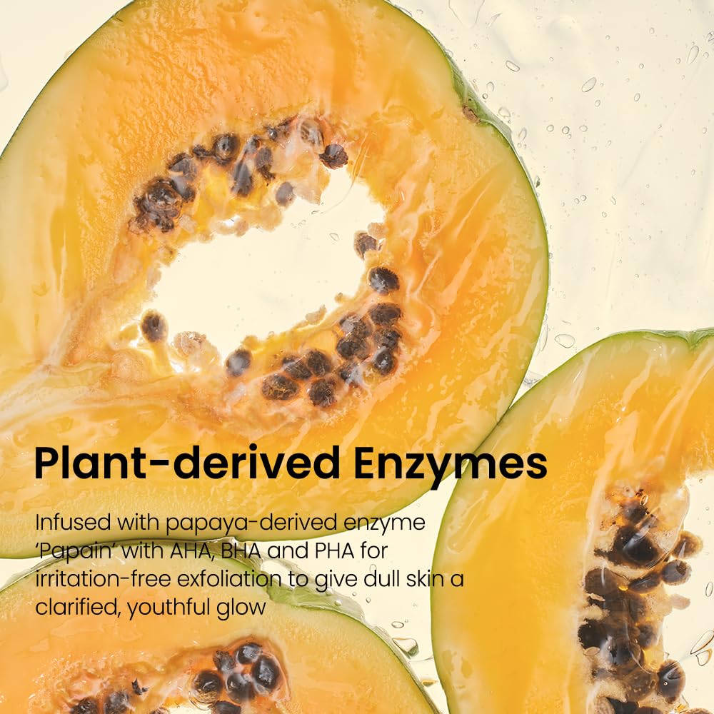 - AHA, BHA, PHA & PAPAIN: Salicylic acid, Glycolic acid, Lactic acid and Papain enzyme, derived from Papaya Fruit, exfoliate dead skin and polishes skin texture, leaving it feeling softer, smoother and more supple.