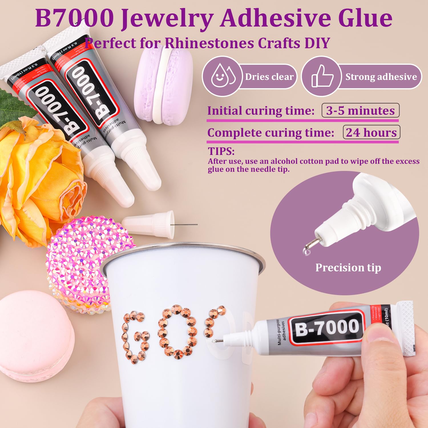 - 🌈B7000 CLEAR GLUE FOR GEMS -- Our B7000 glue has strong adhesion and dries clear, non-toxic and harmless to the skin.The glue has a precision needle for easy application, initial cure time is 3-5 minutes and full cure time is 24 hours. The glue will have a slight overflow when first used, before use you can leave the glue head up for a few minutes to avoid overflow. After use, the needle needs to be wiped with an alcohol pad.