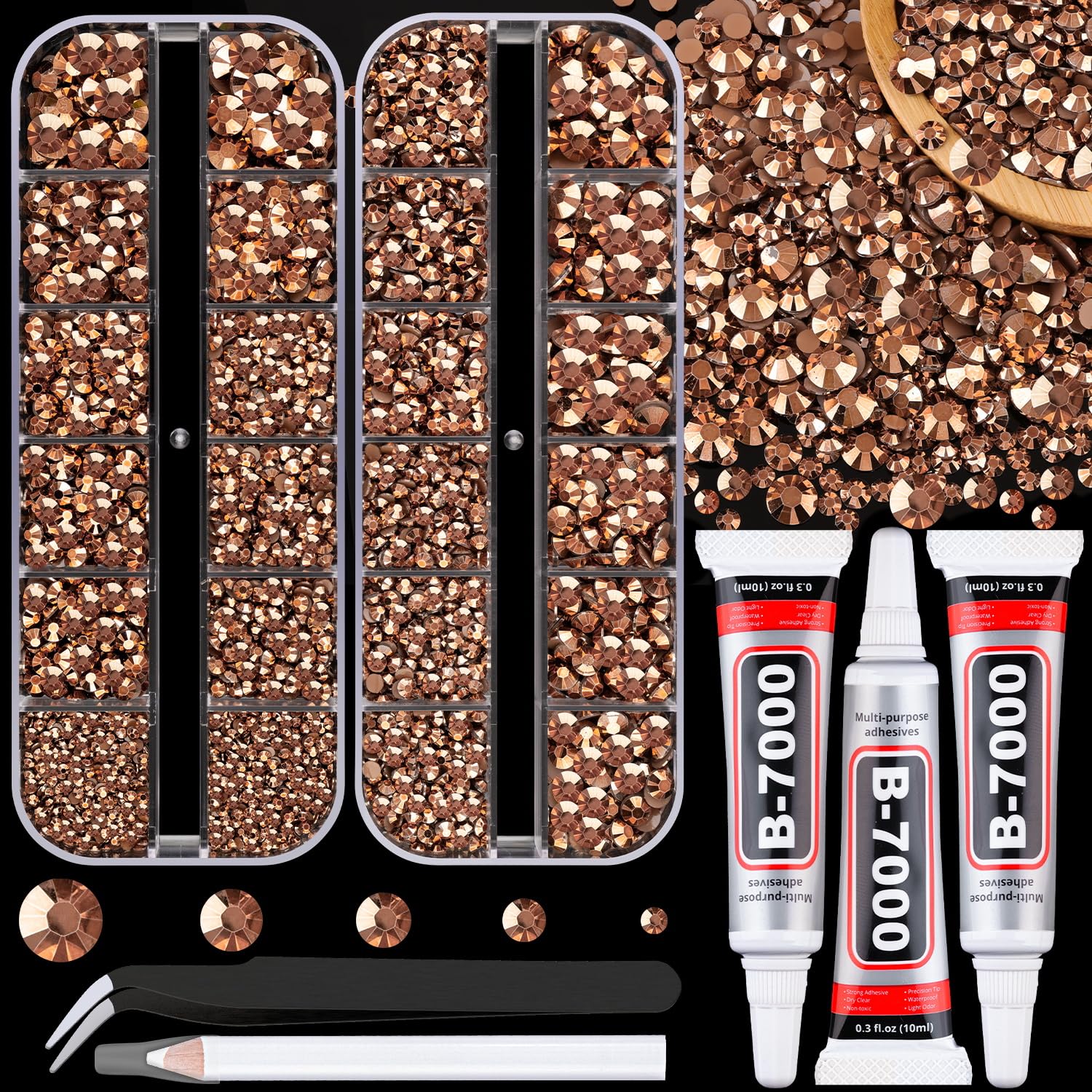 - 🌈WHAT YOU WILL GET -- The package includes 2 box of flatback rhinestones with 12 grids in diffrent sizes:2mm x 2 grids, 3mm x 6 grids, 4mm x 6 grids, 5mm x 5 grids, 6mm x 5 grids. 1 tweezers for large size gems, 1 pickup pen for small size gems. 3 B7000 adhesive jewels glue for jewelry making.This rhinestone kit makes it easy for you to make any craft you like, and will bedazzle your artworks!