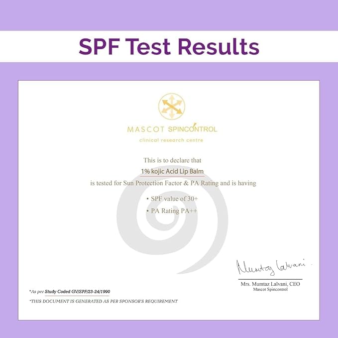 - Product Benefits : 1% Kojic Acid Lip Balm With Alpha Arbutin & Hyaluronic Acid, SPF 30 PA++ for Dark & Pigmented Lips - 4g 1% Kojic Acid Lip Balm With Alpha Arbutin & Hyaluronic Acid, SPF 30 PA++ for Dark & Pigmented Lips - 4g