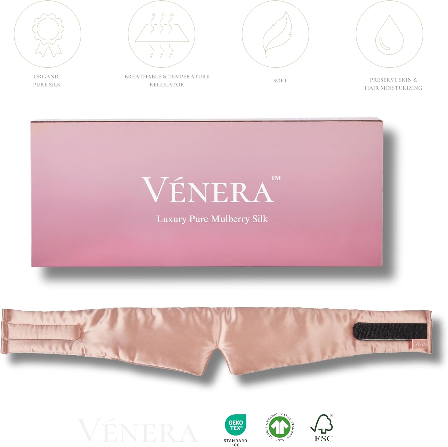 - Fully Adjustable: The wide cushioned Vénera Silk Cloud Mask confidently fits all head sizes with its fully adjustable design. It is highly effective in blocking out all sleep-interrupting light and remains securely on your face in all sleep positions, making it the perfect choice for side sleepers.