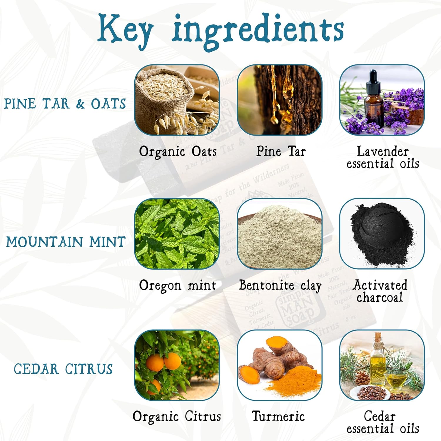 - Skin-loving organic ingredients: Our cold process artisan men's soaps are made in small batches by using organic, fair trade ingredients and pure essential oils. We craft our soap bars by hand using healing and nourishing ingredients like Bentonite Clay, Activated Charcoal, Organic Coconut oil and Turmeric root.