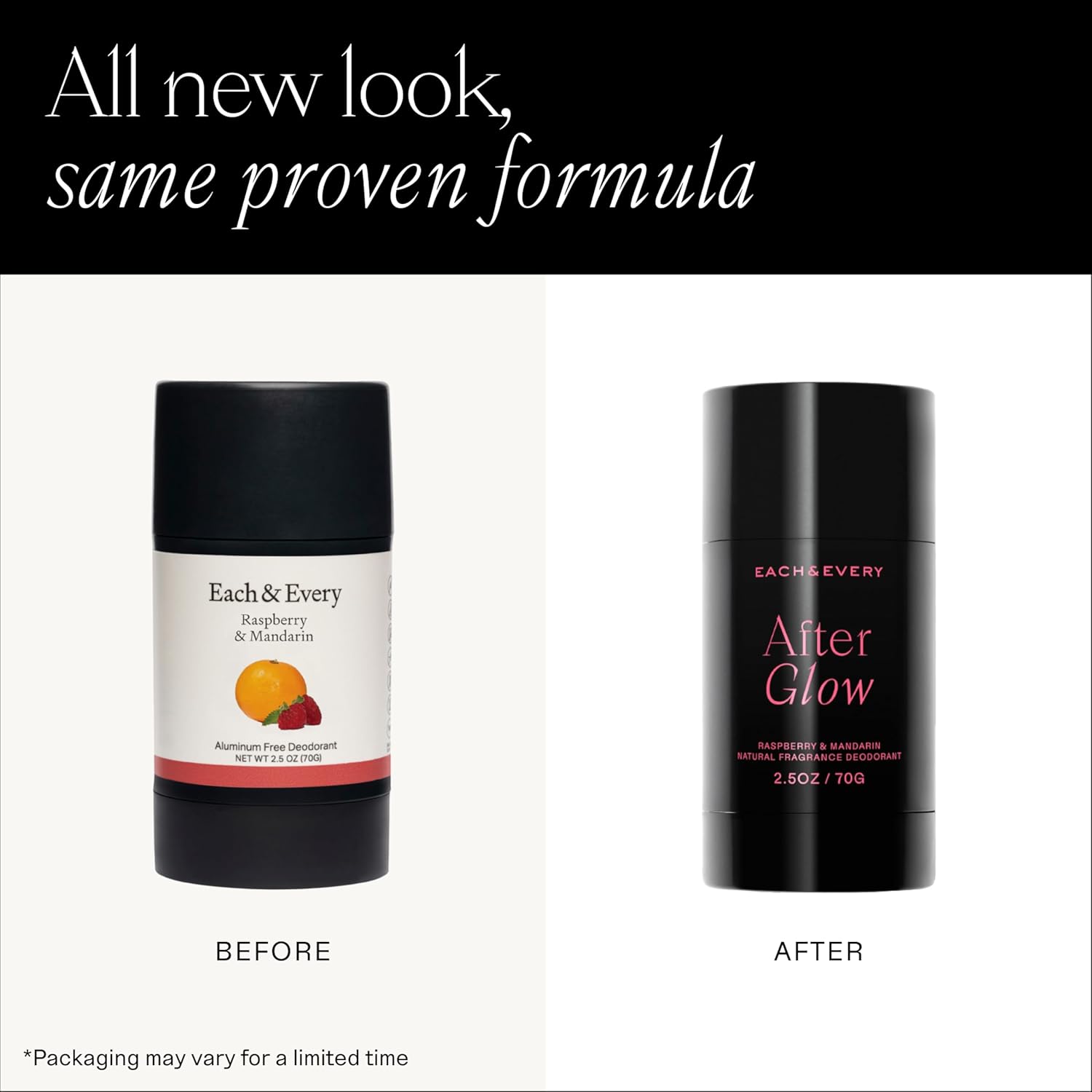 - After Glow - This scent reminds us life is delicious, and full of golden hour walks. Meanwhile, plush tapioca starch and conditioning coconut oil give this sensitive skin deodorant a smooth glide.