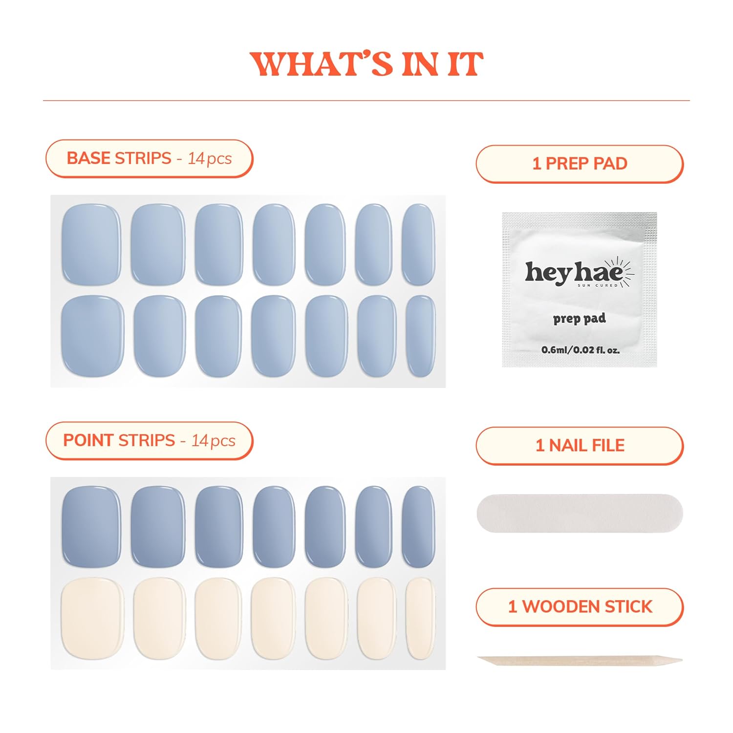 - Enjoy a complete package of fresh salon quality nails done at ease everywhere and anywhere you go! Package includes: 28 strips, 1 Prep pad, 1 Nail file, & 1 Wooden stick.