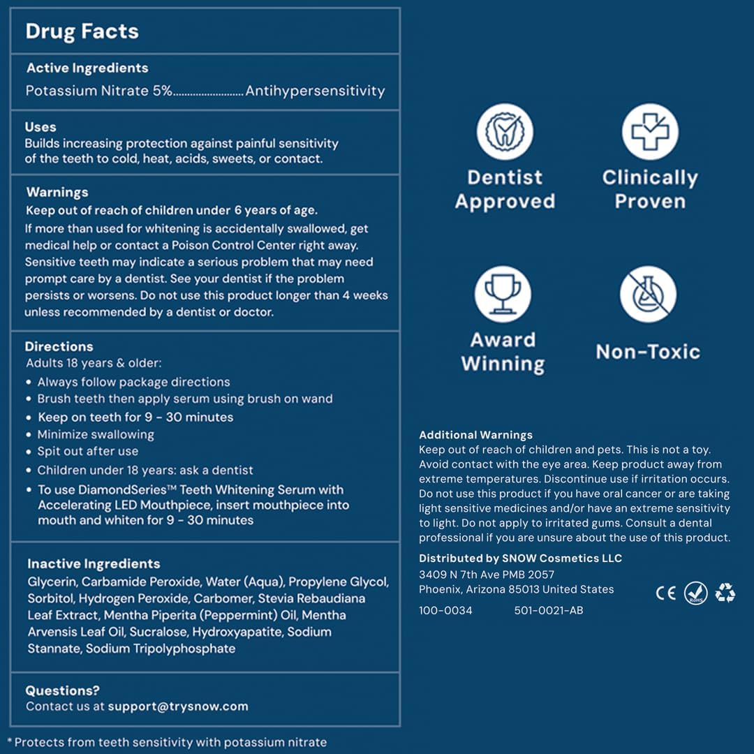 - [Professional Teeth Whitening Kit at Home]: Get a brighter, white smile with the Snow Diamond LED Teeth Whitening Kit. This kit uses LED light technology, similar to dentists, to activate the whitening serum for professional-like results from the comfort of your home.