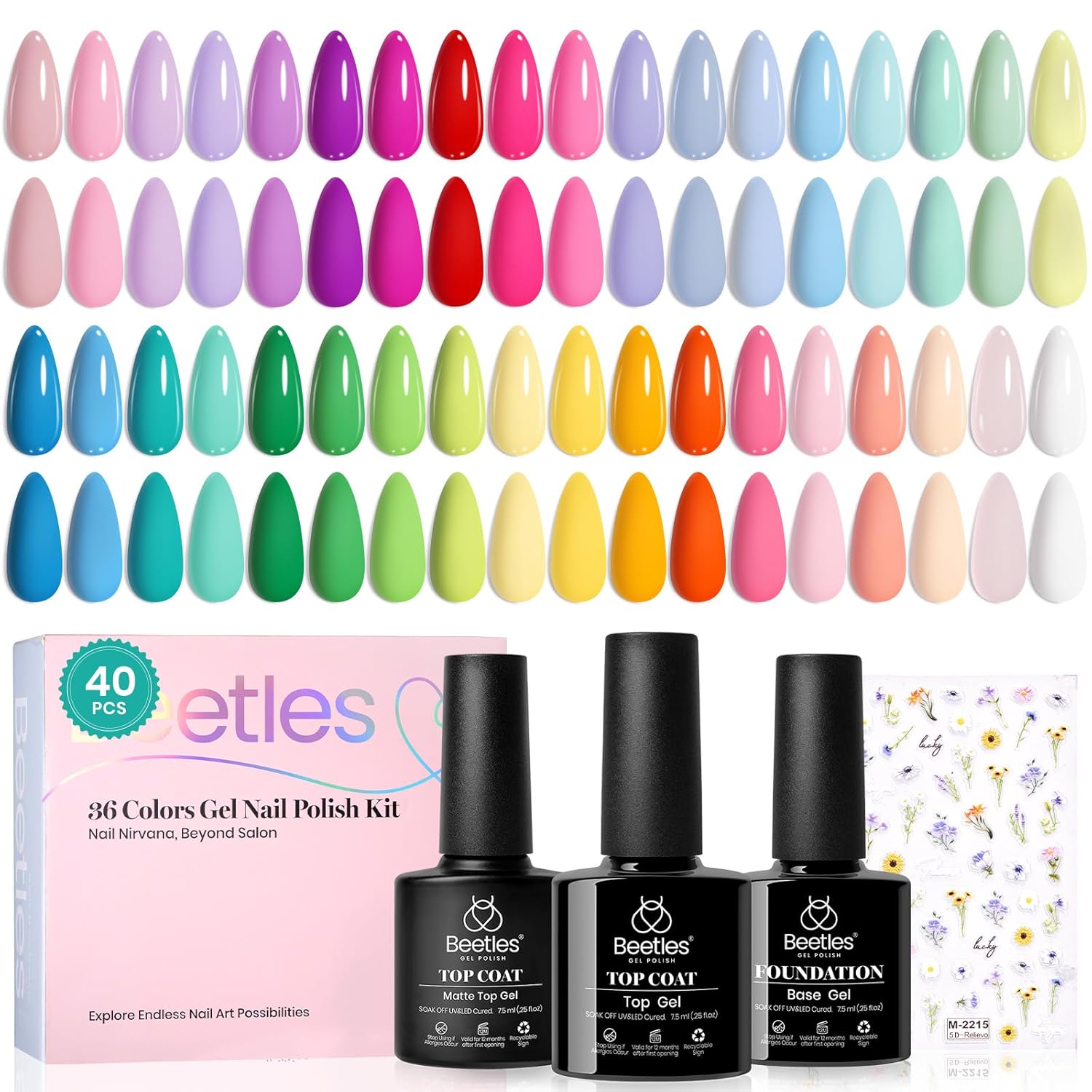 - 【Beetles All Year Nail Art Design】: Beetles 2025 All Year gel nail polish color with 36 different shades of popular and trendy colors, suitable for all seasons and daily routine life! To make it easier for you to design your enthusiasm and vitality manicure, this gel nail kit has thoughtfully included 1PCS Floral Stickers in these nail polish sets. You are free to create floral nail art.
