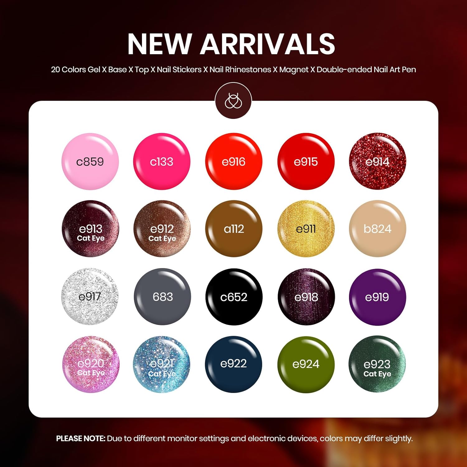 - 【Gel Nail Polish Kit】: Include 5mL Gel Nail Polish X 20,7.5mL Base Coat X 1,7.5mL Glossy Top Coat X 1,7.5mL Matte Top Coat X 1,Double-ended Nail Art Pen X 1,Double-ended Magnet X 1,Leopard Nail Sticker X 1,Rainbow Rhinestone X 1,Instruction Manual X 1,Gel Polish Organizer X 1.