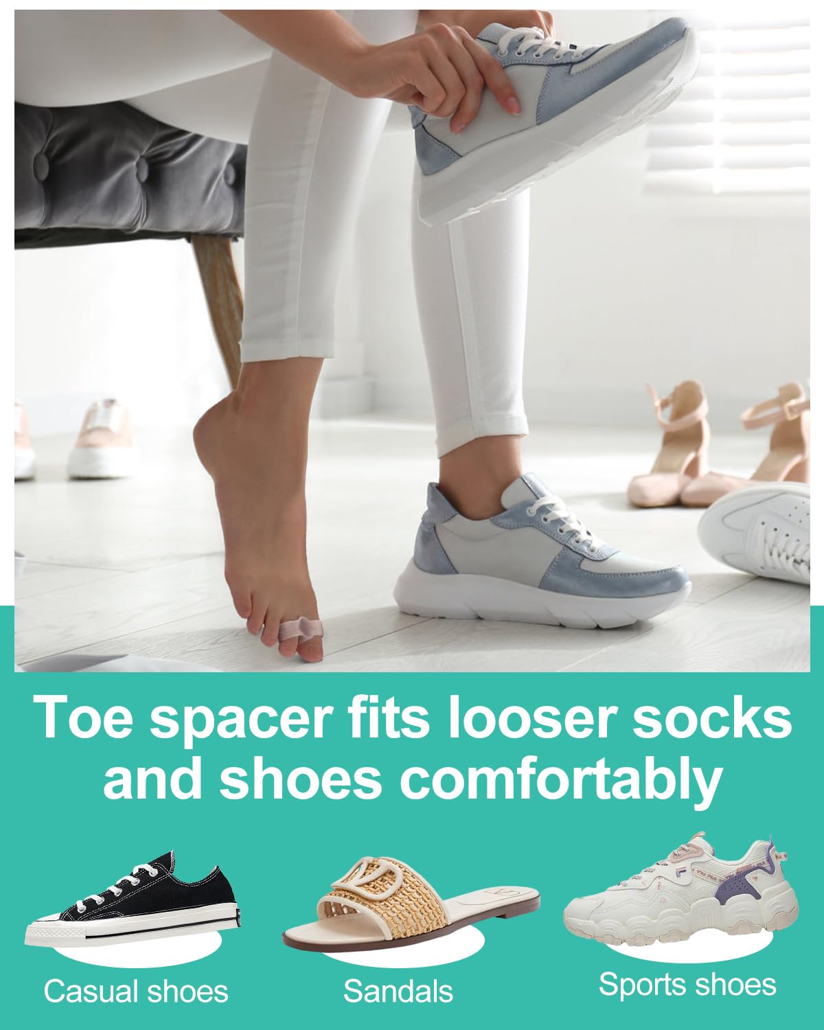 - Big toe straightener: Our big toe spacers set for feet fills the space between the big toe and second toe much better. These clear gel toe separators create about 0.3''space wide between the two toes, they hold in place well and provide good support.