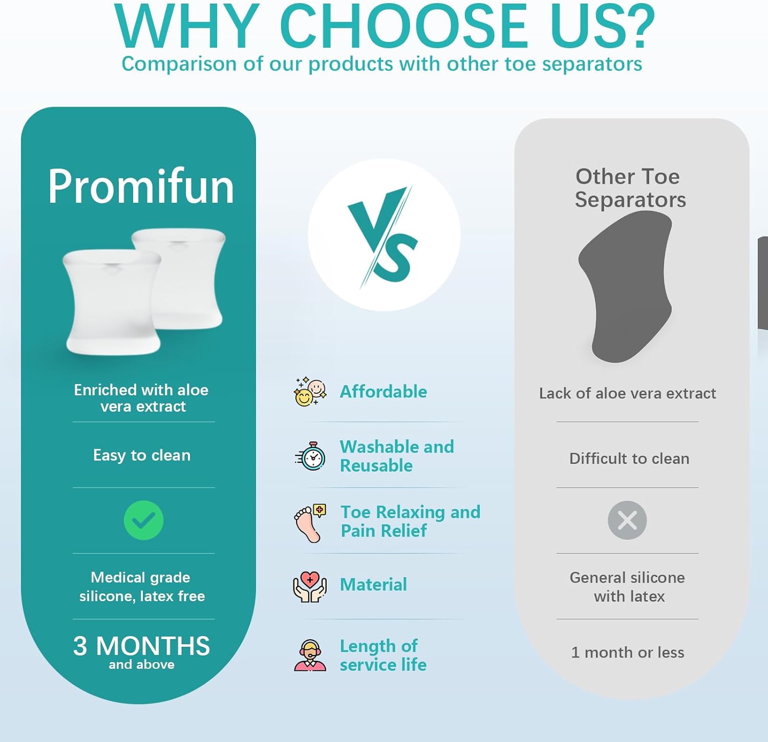 - Soft Gel Material: Our upgraded toe separators are infused with aloe vera extracts and medical grade mineral oil to moisturize the skin and reduce friction. The gel spacers are latex free, feeling very smooth on your skin.