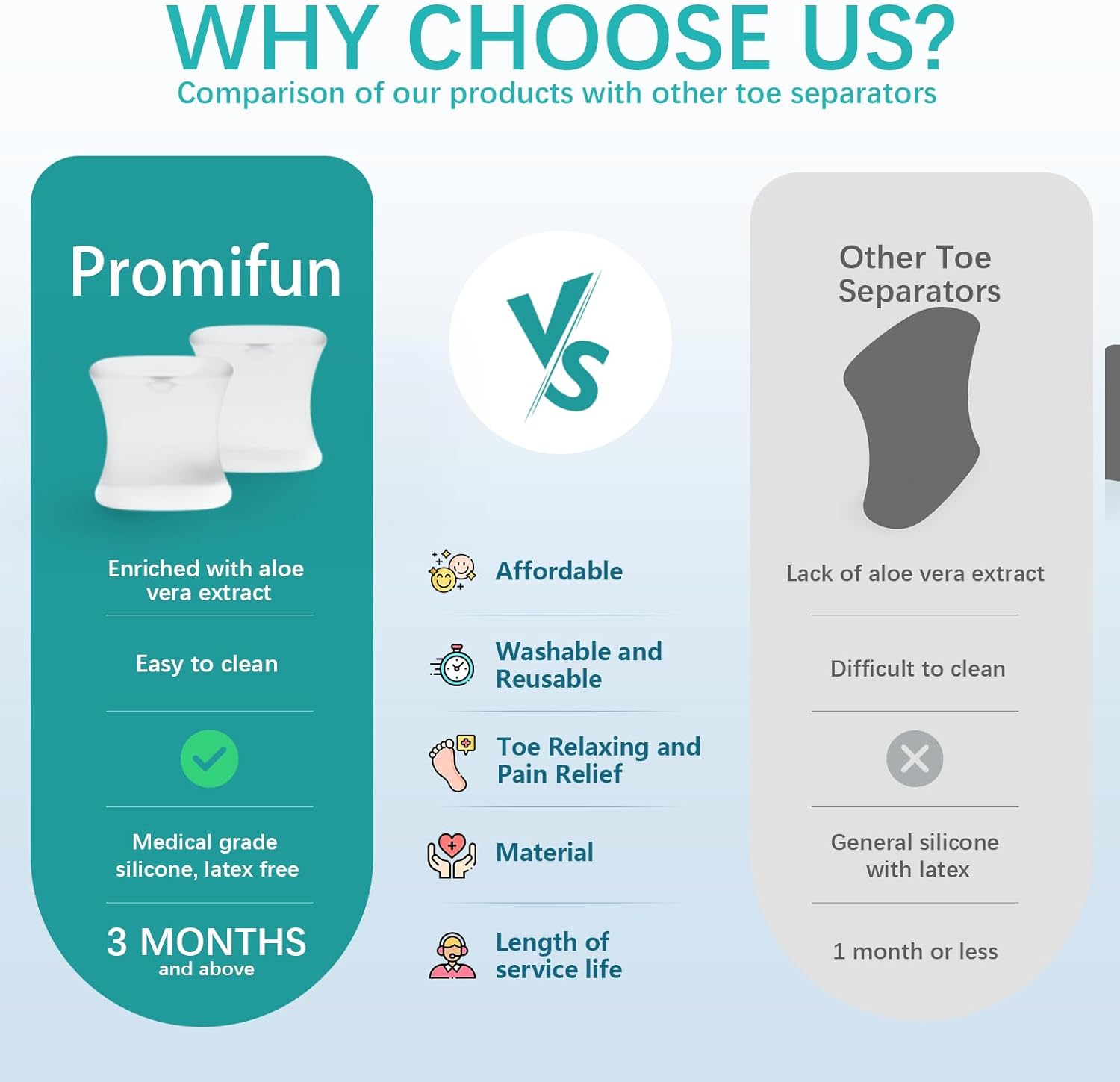 - Soft Gel Material: Our upgraded toe separators are infused with aloe vera extracts and medical grade mineral oil to moisturize the skin and reduce friction. The gel spacers are latex free, feeling very smooth on your skin.
