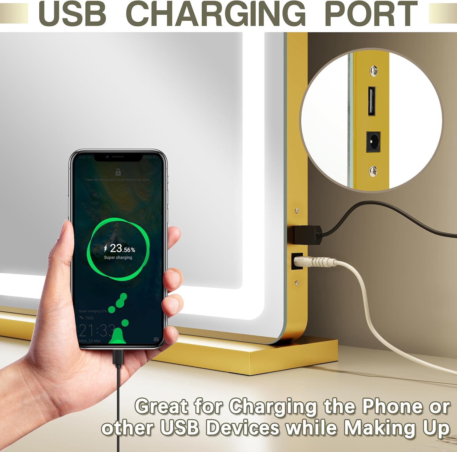 Gold Vanity Mirror with Lights, 32" x 22" Large Lighted Vanity Mirror with Dimmable 3 Modes, LED Makeup Mirror, USB Charging Port, Tabletop or Wall-Mounted