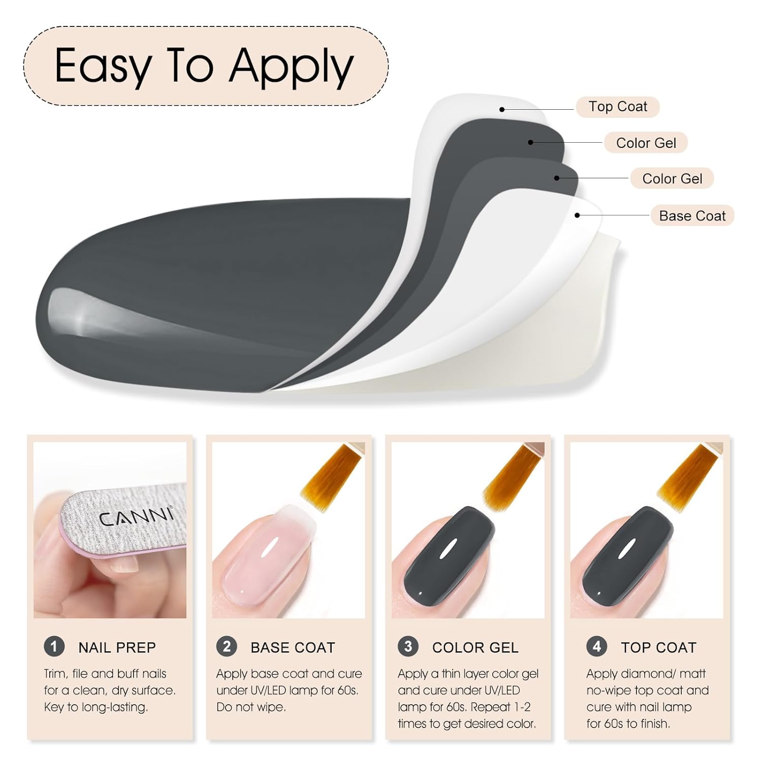 - Easy Application & Good Tenacity: CANNI UV nail polish has professional salon quality, lasts at least 21 days when applied correctly and has perfect shine. It must be used with TOP COAT and BASE COAT during use