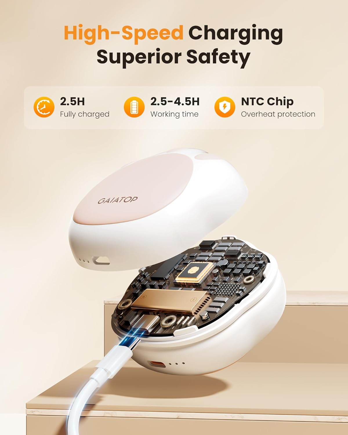 - Long Battery Life: The hand warmers rechargeable lasts for 2.5-4.5 h and fully charged within 2.5 h; Comes with 2 cables so they for charging at the same time; The LED lights are easy to read and tell you what heat level the portable hand warmer is on
