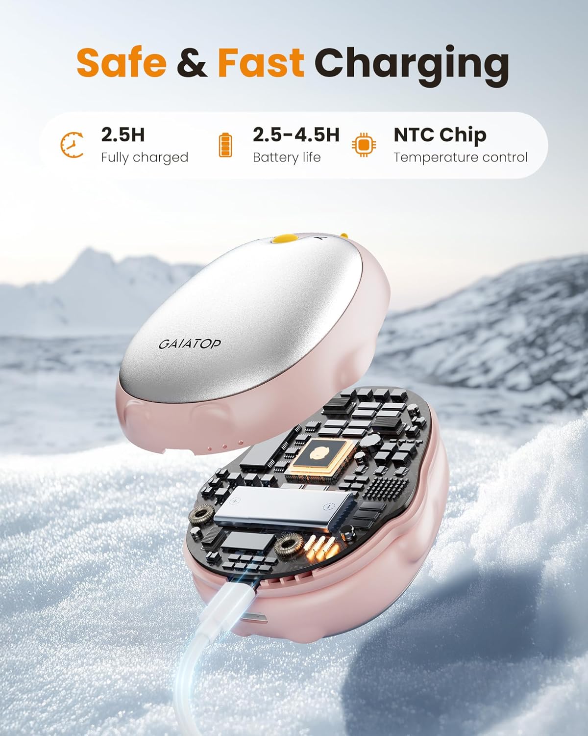 - Long-Lasting Hand Warmers Rechargeable: The reusable electric hand warmer built-in rechargeable batteries, battery life last about 2.5-4.5 hrs, comes with 2 usb cables, the wamer can be fully charged at the same time within 2.5 hrs