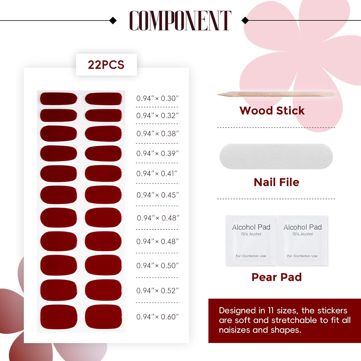 - 【Gel Nail Sticker Set】This no-bake gel nail sticker set includes 22 pcs of gel nail stickers in 11 distinct sizes, along with 2 preparation pads,a nail file,and a wooden stick
