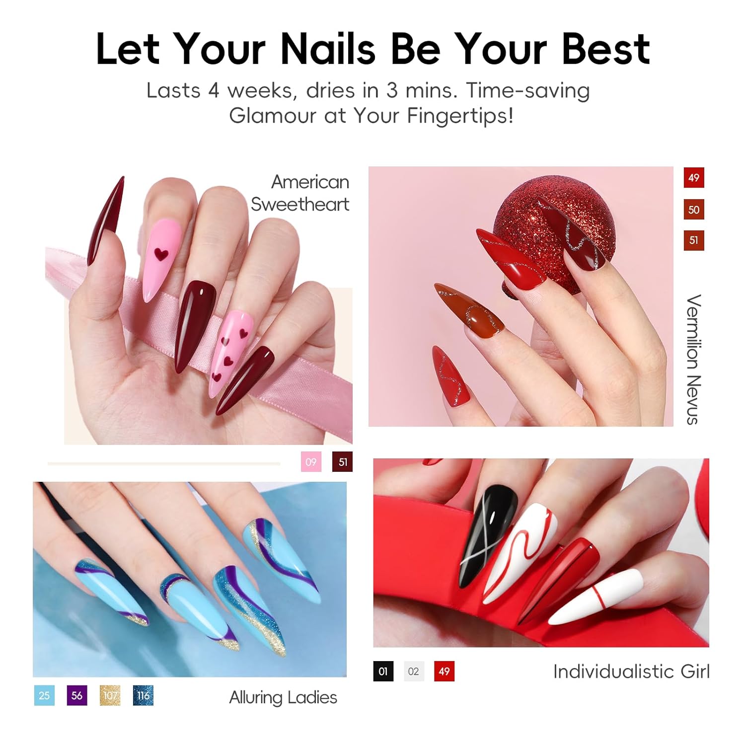- 【Classic & Long-lasting Gel Polish】Our gel nail polish is formulated with natural resin, ensuring low odor and a high-gloss finish. The kit features 35 rich colors, including basics and unique shades such as pink ,nude, red, orange, green, blue, purple, white, brown, black and more. 4 different top coats for endless combinations. When applied correctly, the gel polish can last up to 3 weeks