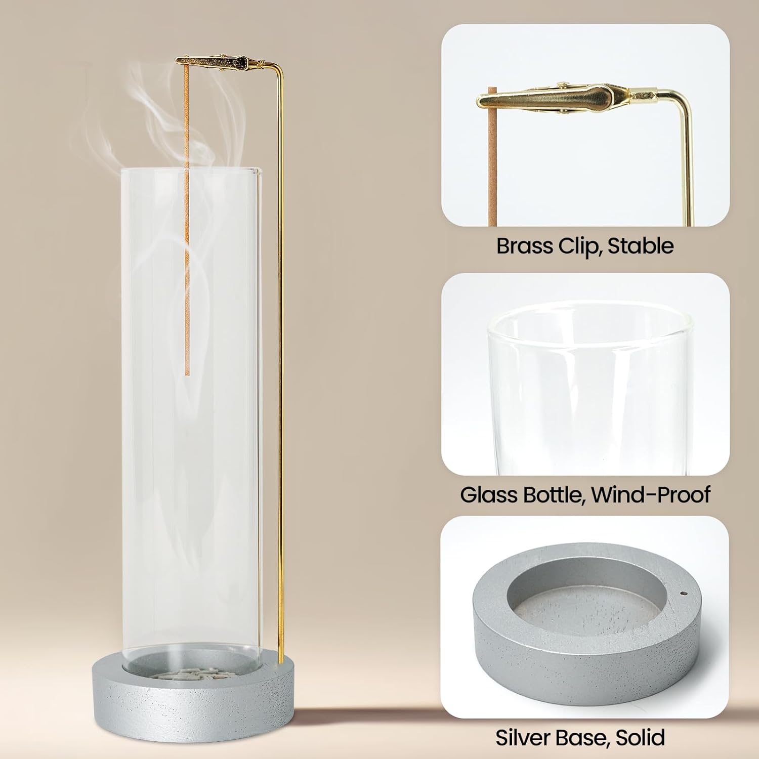 - Package Includes: Glass ash catcher, brass support rod, wood base, base gasket, and 30 incense sticks. The base hole may be tight initially, so a little forcefully rotate the support rod when inserting it.