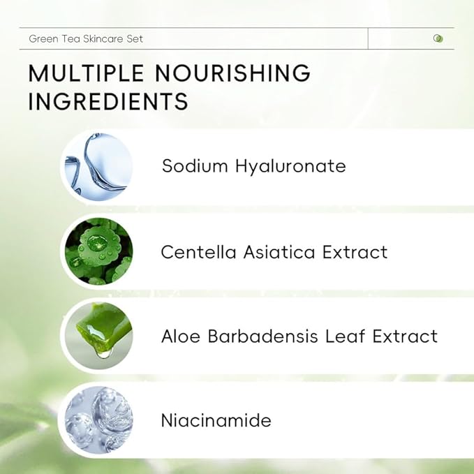 - 【Natural Moisturizing Ingredients】Our skin care sets & kits are extract natural Green Tea extract and a variety of mild skin care ingredients, which can penetrate deep into the bottom layer of the skin, continuously replenish moisture to the skin, to achieve long-lasting moisturizing skin care.