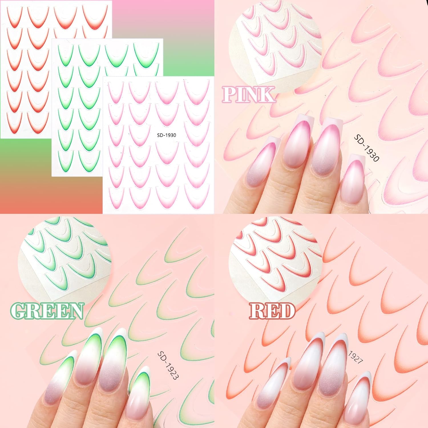 - 【3D Gradient French Tip Stickers】You will receive 12 sheets 3D French nail stickers in different colors, each with French line patterns of different sizes. Gradient French nail stickers and decal stripe designs combine popular elements, with simple design and rich colors, enough to satisfy your various French nail designs.