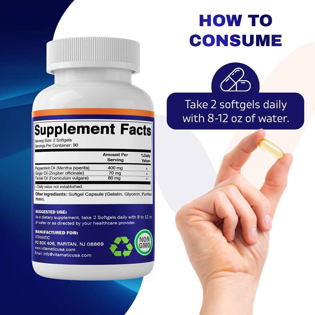 - Vitamatic Peppermint Oil Gel contains 550mg of peppermint oil per serving, along with ginger and fennel oils, to provide natural digestive support.