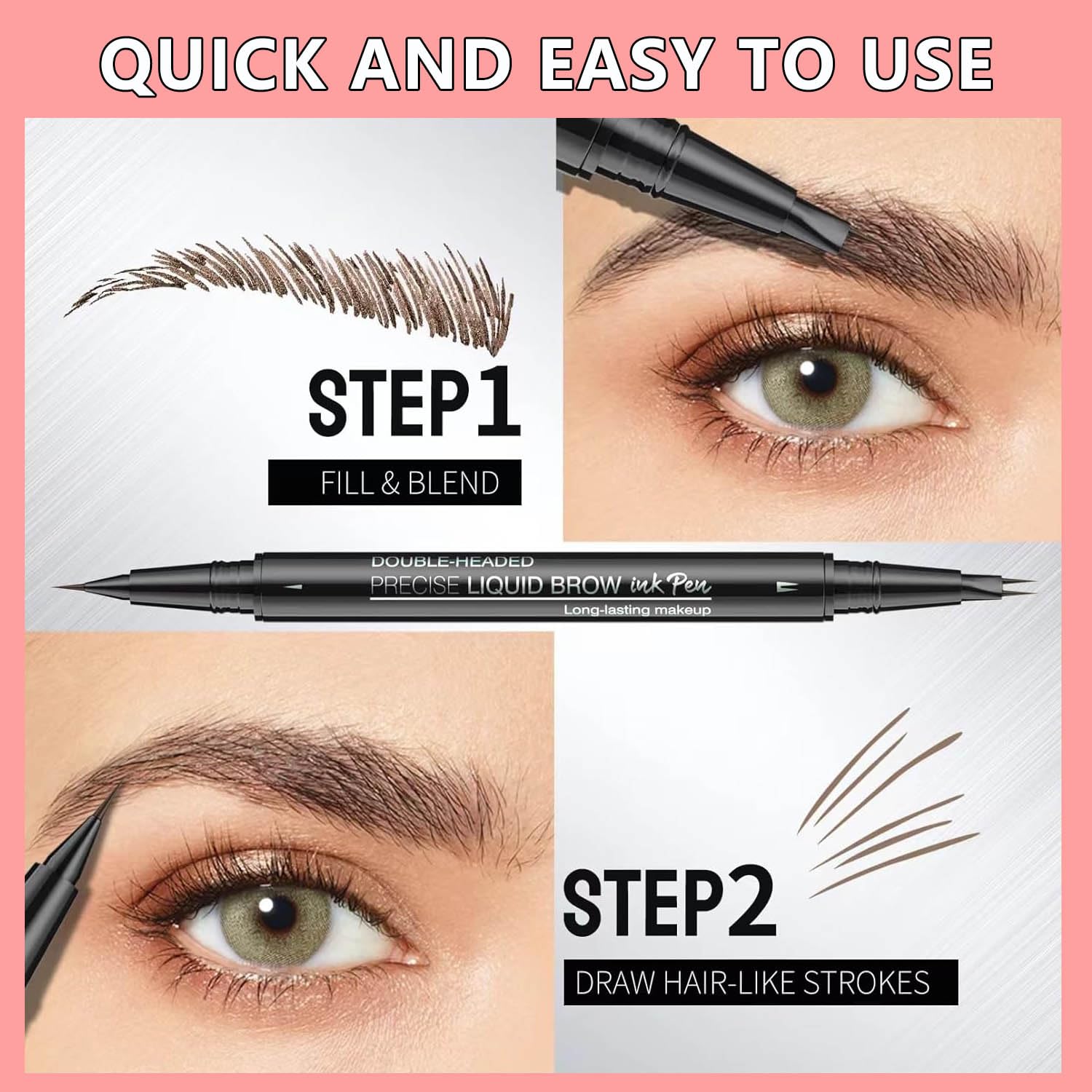 - Dual-Ended Design: Innovative curved brow pen has precise brush-tip to create tiny hair-like strokes for natural finish, curved tip to fill in sparse areas, blend color into brows, natural-looking brows.