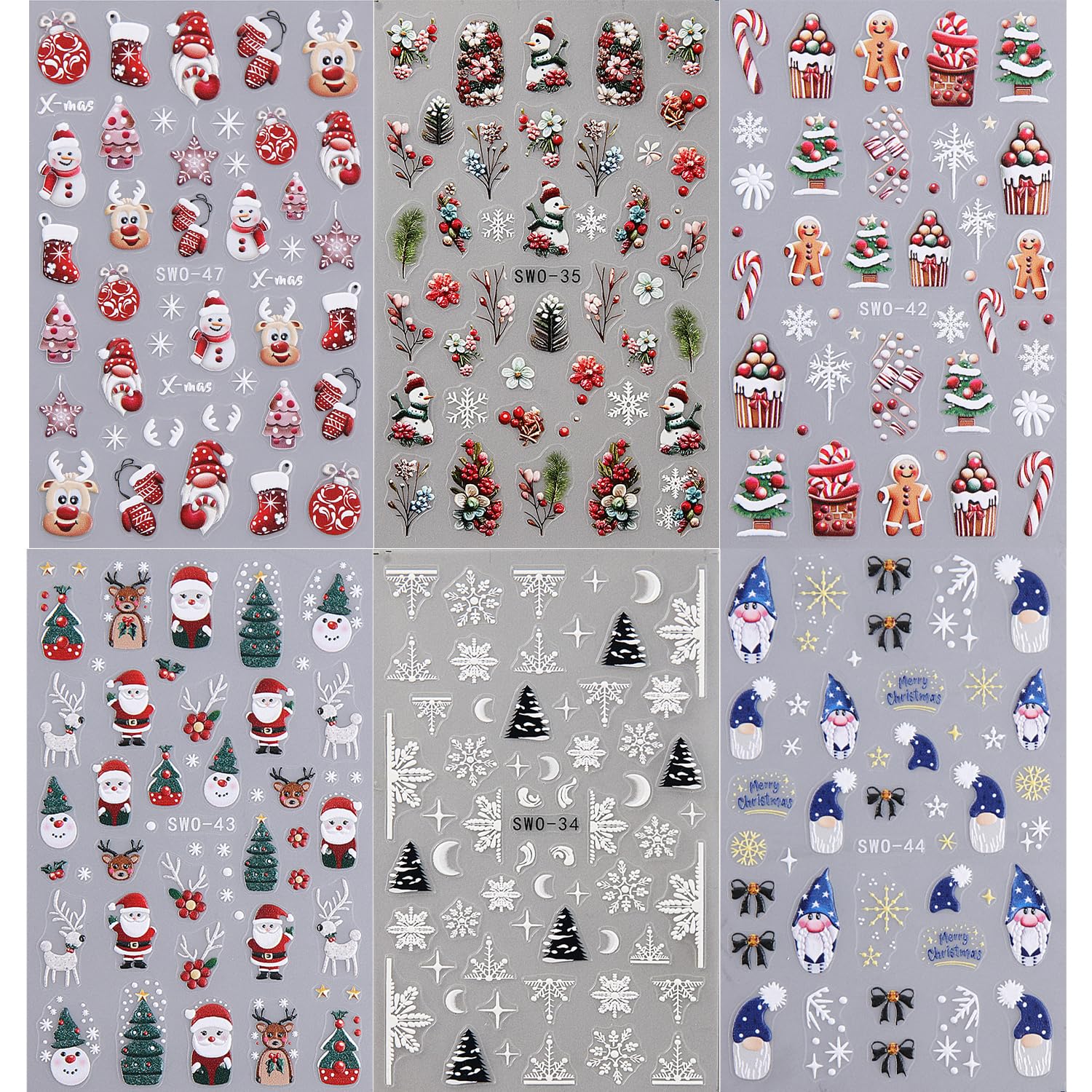 6 Sheets Christmas Nail Art Stickers 5D Self-Adhesive Embossed Cartoon Santa Claus Elk Bluebird Designs Xmas Decals Winter Christmas Snowflake Lamp Ball Nail Stickers Supplies for DIY Manicure Decor