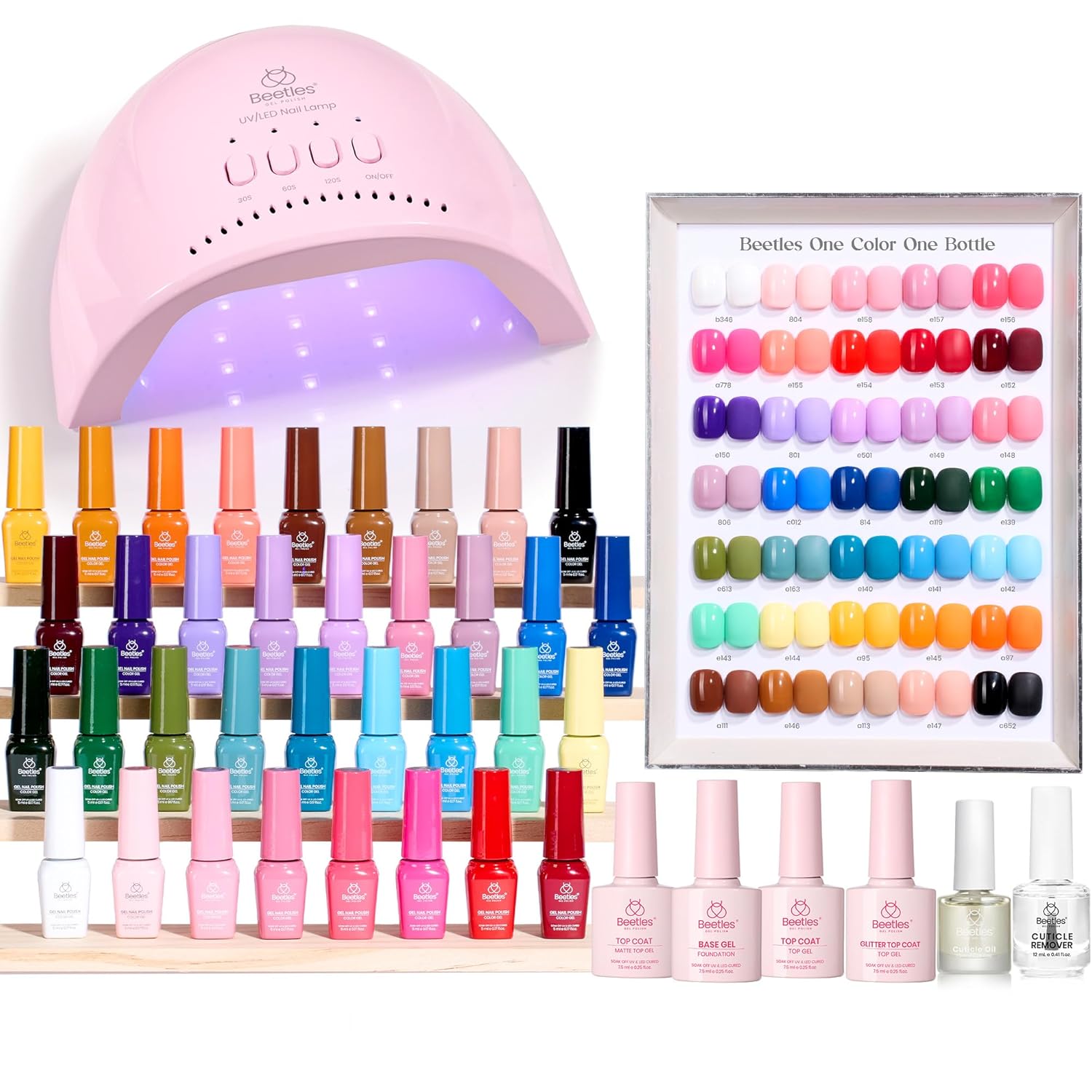 - Beetles Mood Mosaic 35 Colors Gel Set: This Gel Nail Polish Kit includes 35 multi-color gel nail polish for all season, 1 bottle of base coat, 1 bottle of no wipe top coat, 1 bottle of matte top coat, 1 bottle of glitter top coat, a professional nail lamp, and 28 pcs nail stuff tools. Meet your nail Manicure needs at home. The new appearance design of gel polish helps you have quick fashionable manicure.