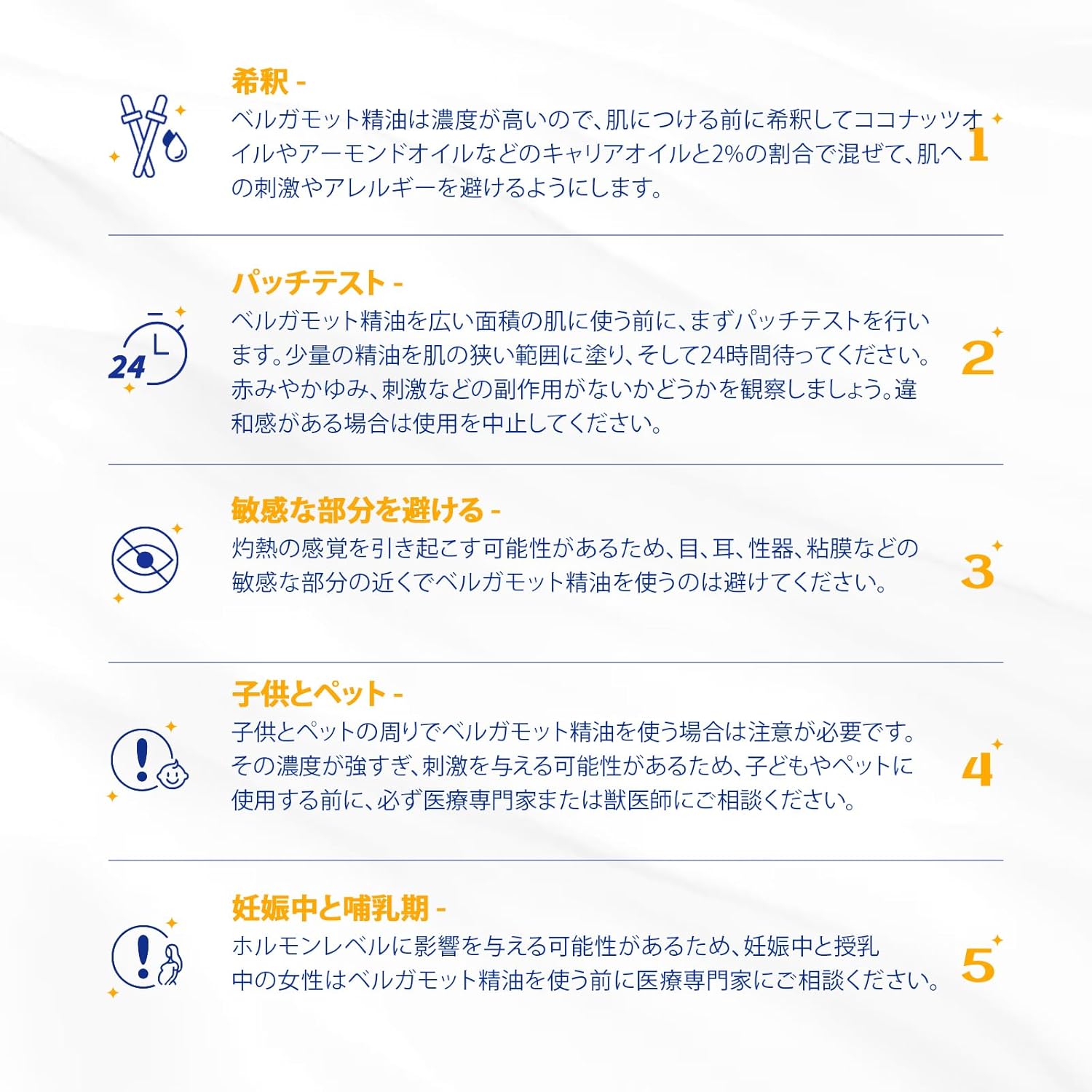 - [ 𝐁𝐥𝐞𝐧𝐝 𝐌𝐮𝐥𝐭𝐢𝐩𝐥𝐞 𝐄𝐬𝐬𝐞𝐧𝐭𝐢𝐚𝐥 𝐎𝐢𝐥𝐬 ] - Combine 4-5 drops of bergamot essential oil for every 20 mL carrier oil, take an appropriate amount in your palm and apply to the desired area of the body in a circular motion for a relaxing massage experience. It can also be used with Tea Tree essential oil to cleanse and nourish the skin. In addition, Bergamot essential oil can be used with Lemon, Eucalyptus, Sandalwood, Rose and Chamomile essential oils to enjoy even more benefits