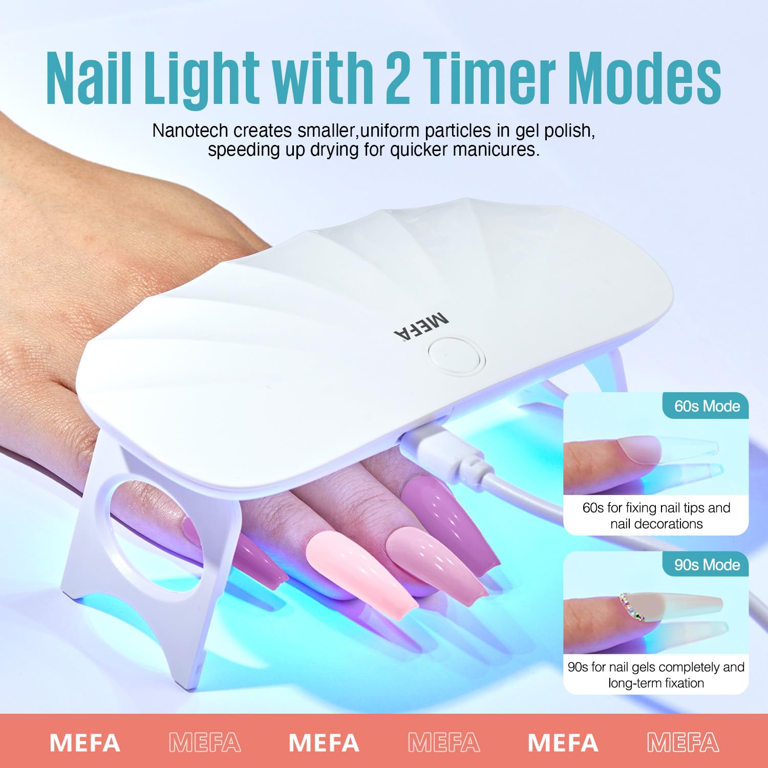 - 6W Mini Portable UV Light: This cute led lamp for gel nails is a universal USB interface design and the lamp dries nails efficiently with three timing settings (30s/60s/90s); you could carry it around without any pressure