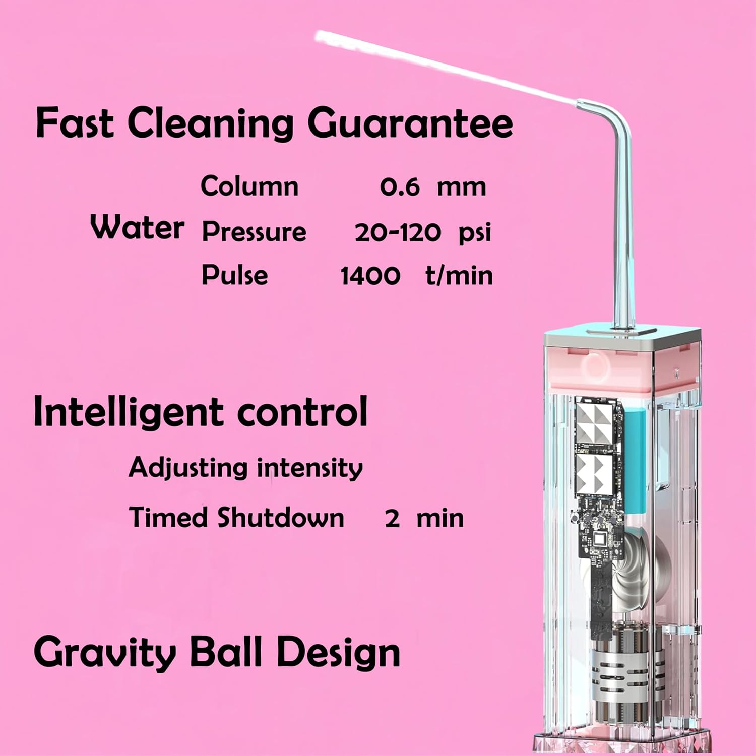 - 3. 4 CUSTOM MODES -soft, moderate, strong pulse, DIY. Water column of 0.6mm. Adjust from Gentle (20PSI) to Turbo (120PSI) with 1400 pulses/min.for plaque removal 99.9% and gum care (laboratory data)