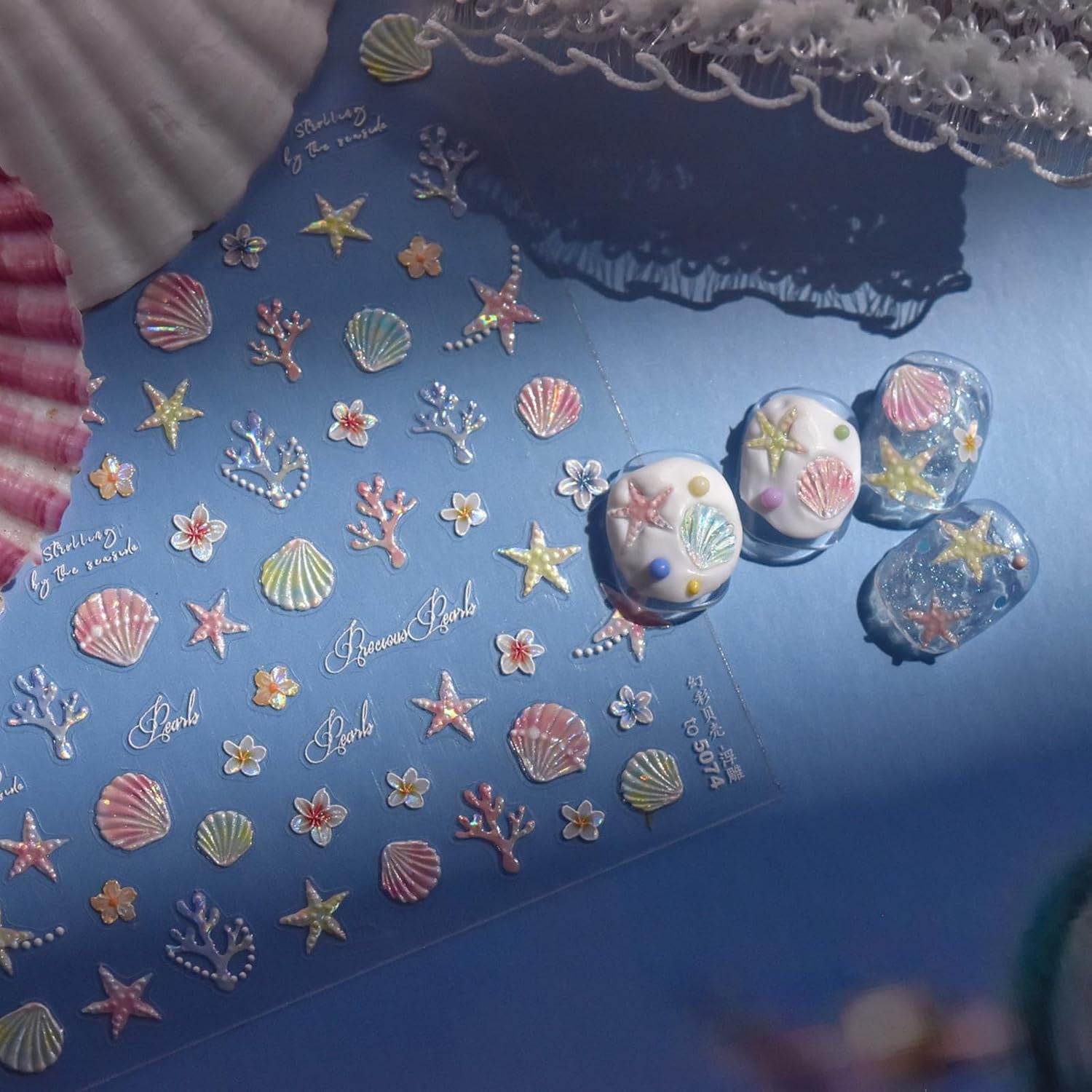 Starfish Nails Stickers Ocean Nail Art Decals Marine Organism with Design Summer Beach Nail Art Stickers for Women Girls Kid 5D Embossed Self Adhesive Manicure Supply Decoration
