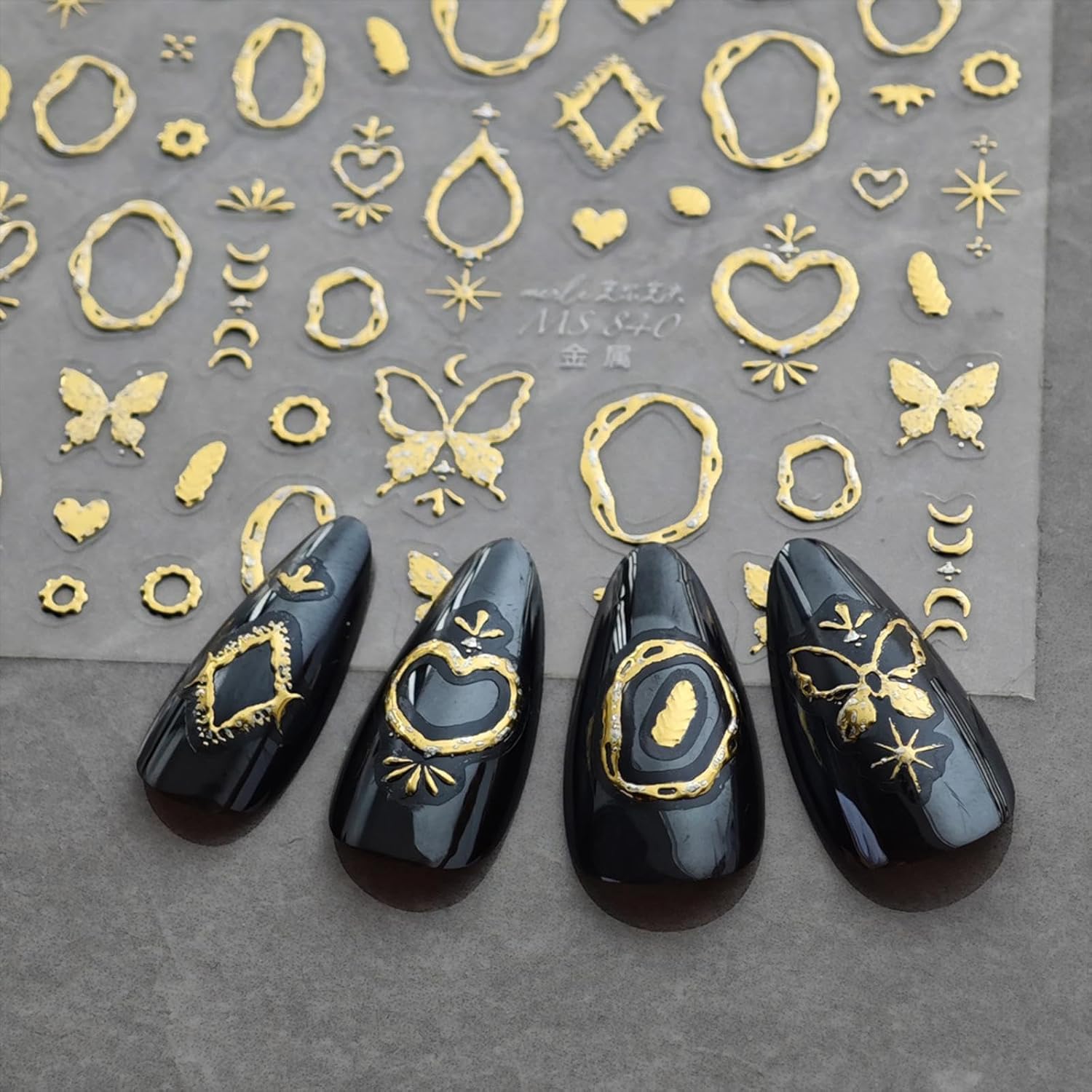 Gold Nail Art Stickers Butterfly Heart Nail Decals with Golden Design 5D Embossed Self Adhesive Nails Supply for Women Girls Kid Manicure DIY Decoration Accessories