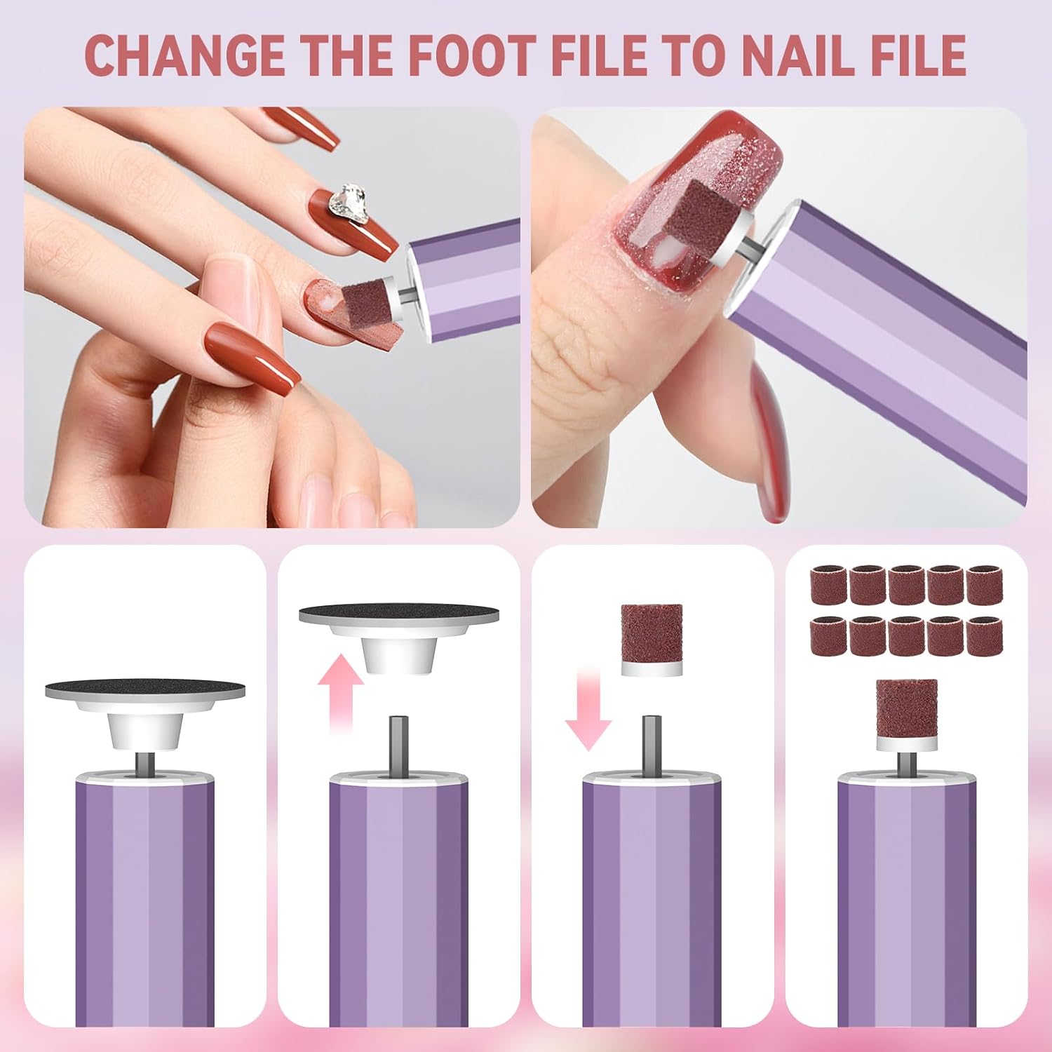 - 【HOW TO USE THIS PEDICURE TOOlS】Use our foot sander as follow step can make a better effectiveness: Step 1 - soak our foot for 20-30 minutes with warm water, to soften feet dead skin. (PLEASE DO NOT SKIP THIS STEP). Step 2 - Choose the electronic foot file or the nail file, tear off the protective film of sandpaper disk, paste it on the machine well. Step 3 - Choose the gear and rotation direction begin the exfoliation process. Step 4- clean it and apply moisturizing cream to the skin
