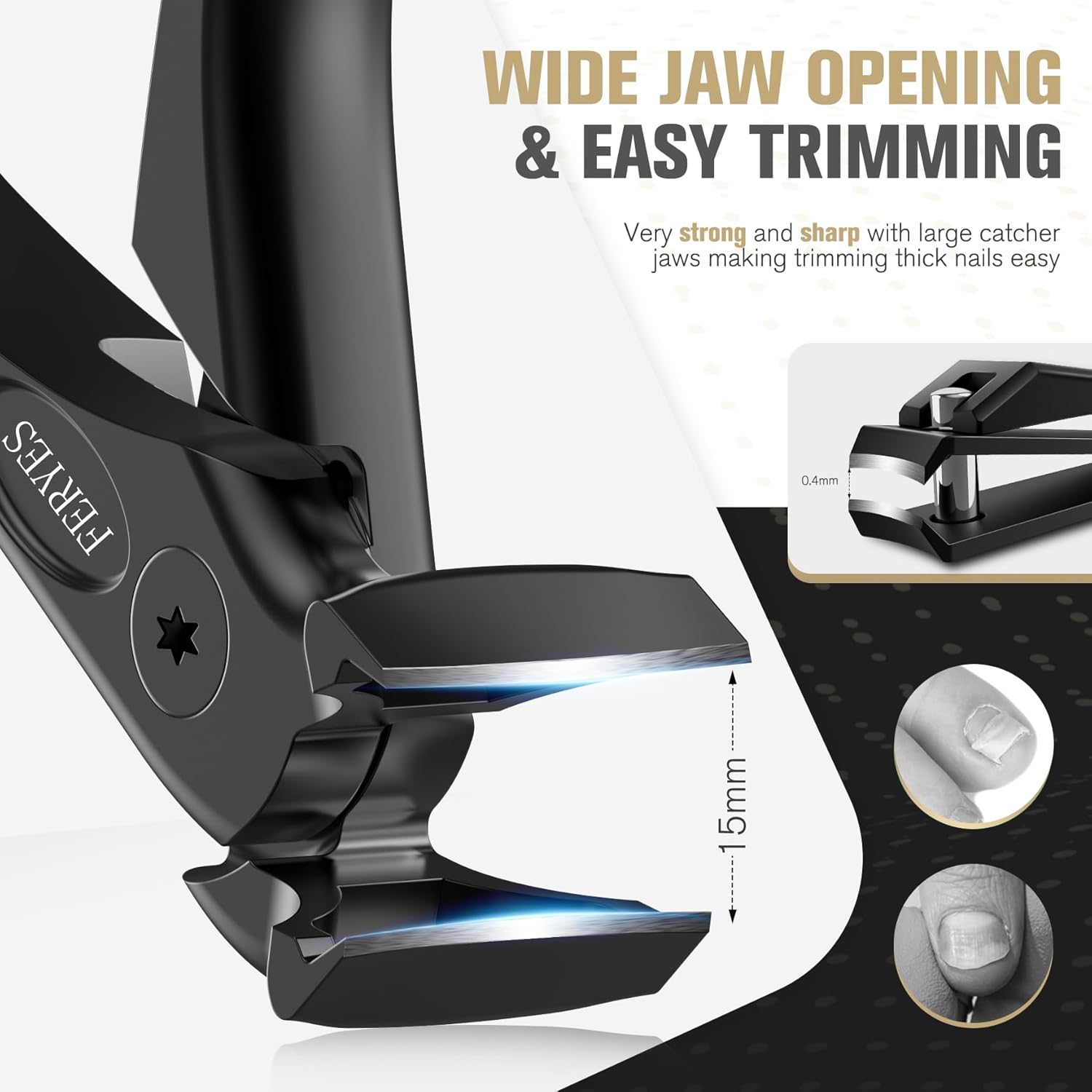 - Say Goodbye to Tough Nails:FERYES nail clippers are designed with very strong and sharp cutting edges to ensure precise and clean cutting every time, preventing nail splitting and tearing.The jaws of Innovative large toenail clippers can open up to 0.6 inches, making it easy to trim hard and thick nails
