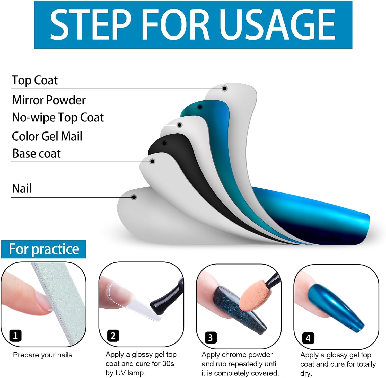 - PACKAGE CONTENTS:1 PCS chrome nail mirror pigment powders. It needs to be used with gel nail polish and no wipe top coat. They can make many different design for your gel nail polish. It gives different color base a pearly shine for your nails