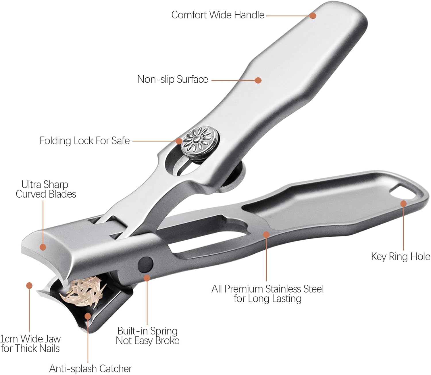 - Say Goodbye to Messy Clippings: Built-in catcher & splash-proof design, the unibody catcher and anti-splash blades keep nail fragments contained, protecting your eyes and floors. Perfect for travel or home use—no cleanup needed