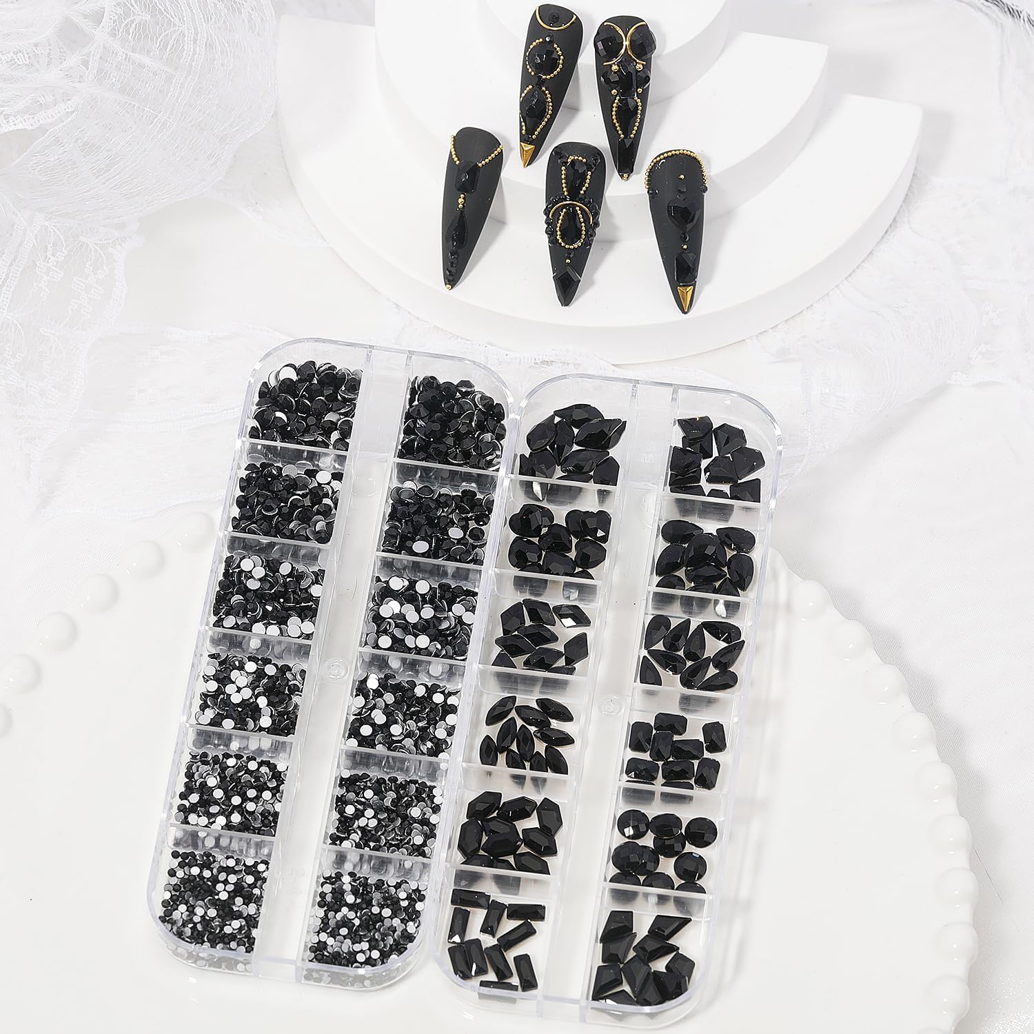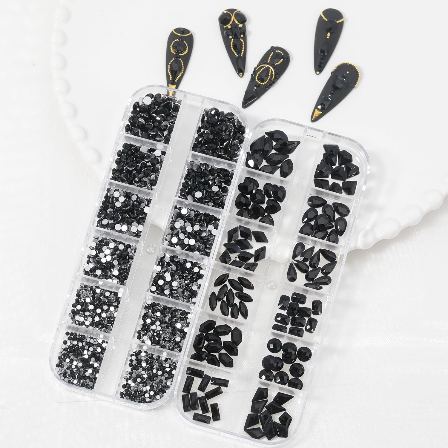 Nail Rhinestones - 3D Multi Shape Size, Flat Back, Manicure Rhinestones Charms, Crystal Black Gems, with Kit, for Nail Art, Bedazzling Acrylic Nails, DIY Decor
