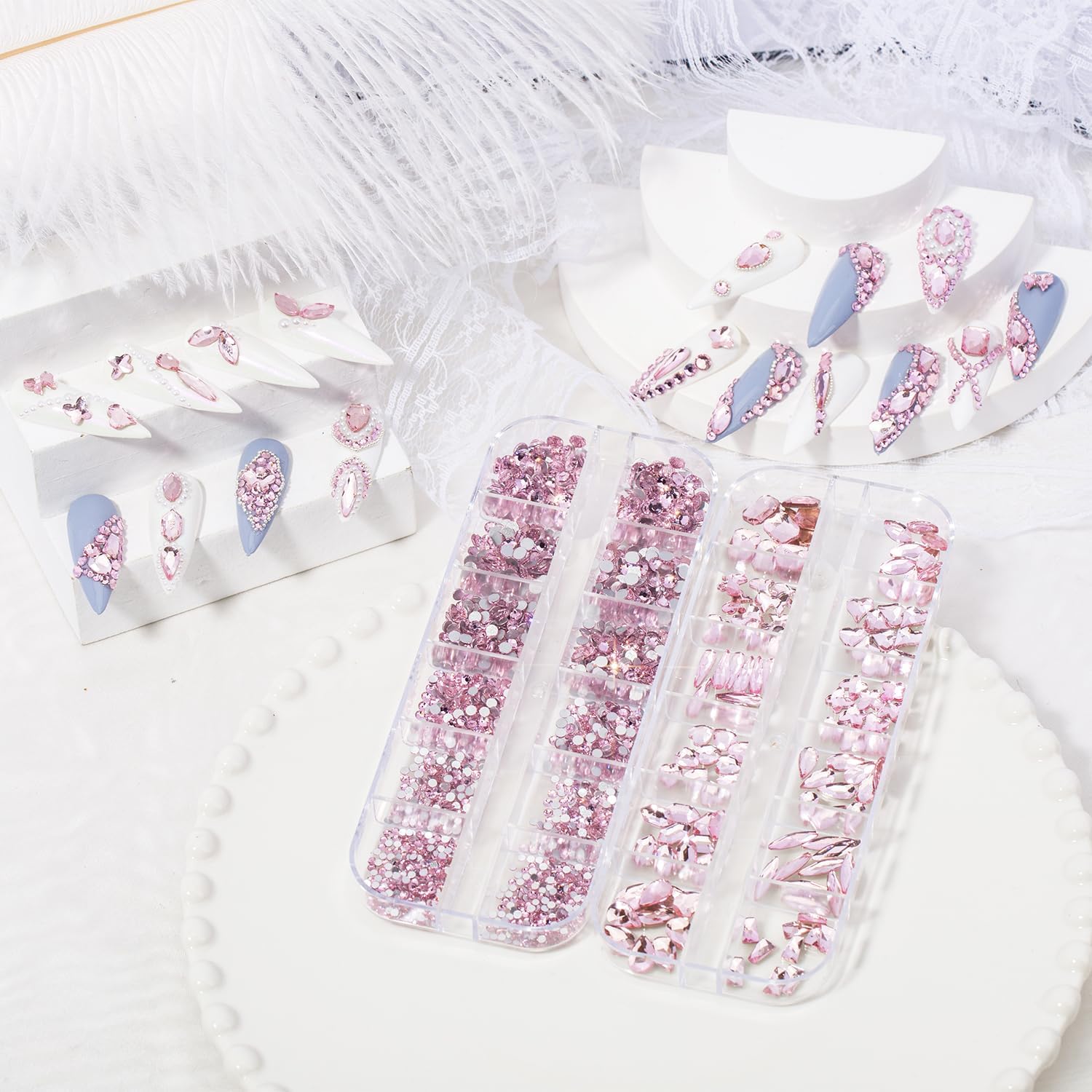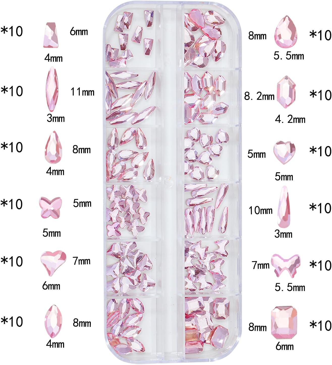 - ★Light pink Rhinestones and Gems - contains 2 boxes of nail art rhinestones, Light pink flat back nail rhinestones, multi-shape nail gem rhinestones, 1 tweezer, 1 piece of rhinestone pen and 6 sizes round nail art rhinestones are 1.8mm, 2mm, 2.5mm, 2.8mm, 3mm, 4mm, different sizes of mixed crystal rhinestones can match different nail art styles.