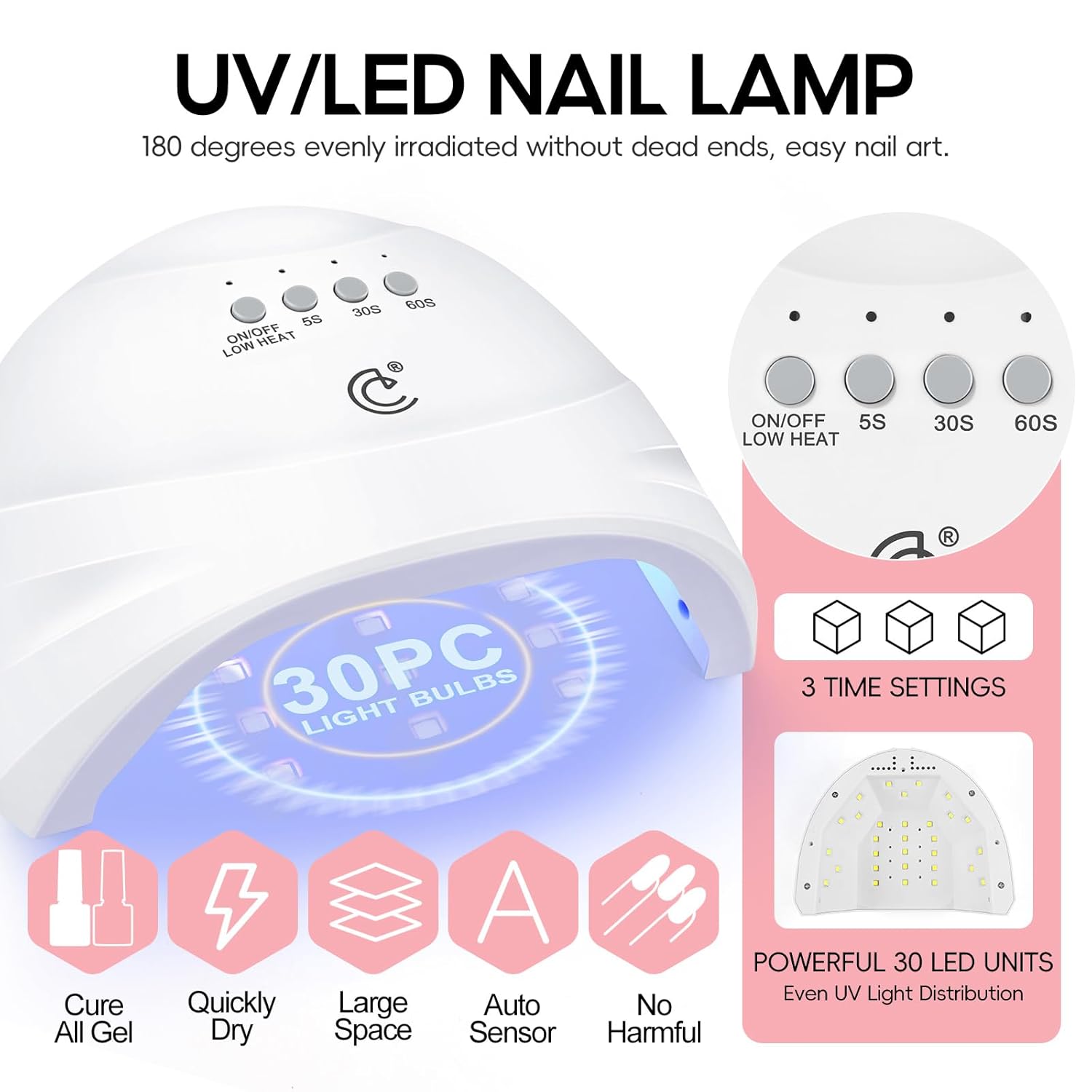 - ❤ Professional Nail Light: This gel polish kit with u v Light contains great upgraded U V Lamp. This nail lamp is automatic sensing, large space, and 30 pcs uniform distributed lamp beads, low heat mode, 3 Timer Setting - 5S / 30S / 60S, you can choose time according to your needs. The nail lamp is suitable for all gel, convenient and fast, easy to use.