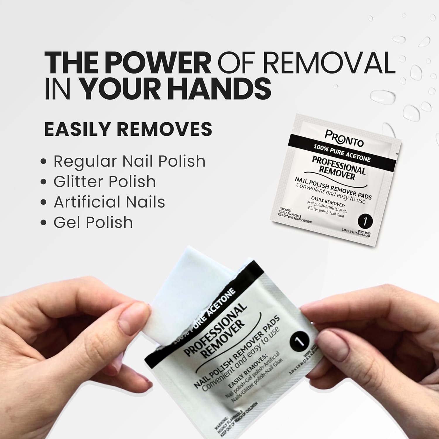 - NAIL KIT ESSENTIAL: These Pronto pure acetone nail soak off pads are a must-have for every nail tech supplies collection. Capable of removing stubborn dry nail polish, they are indispensable for maintaining a professional nail polish set.