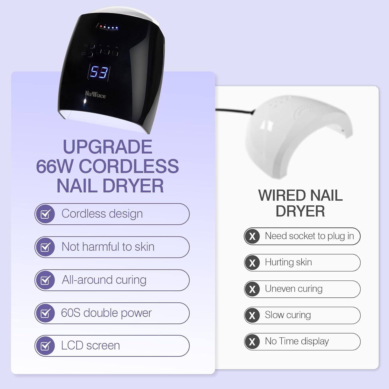 - Cordless UV Nail Lamp Rechargeable: Our 66W cordless gel nail lamp features 33 LED bulbs for fast curing; Wireless design eliminates cord restrictions while maintaining safe low-temperature operation; Ideal for gel polish, acrylics, and extensions