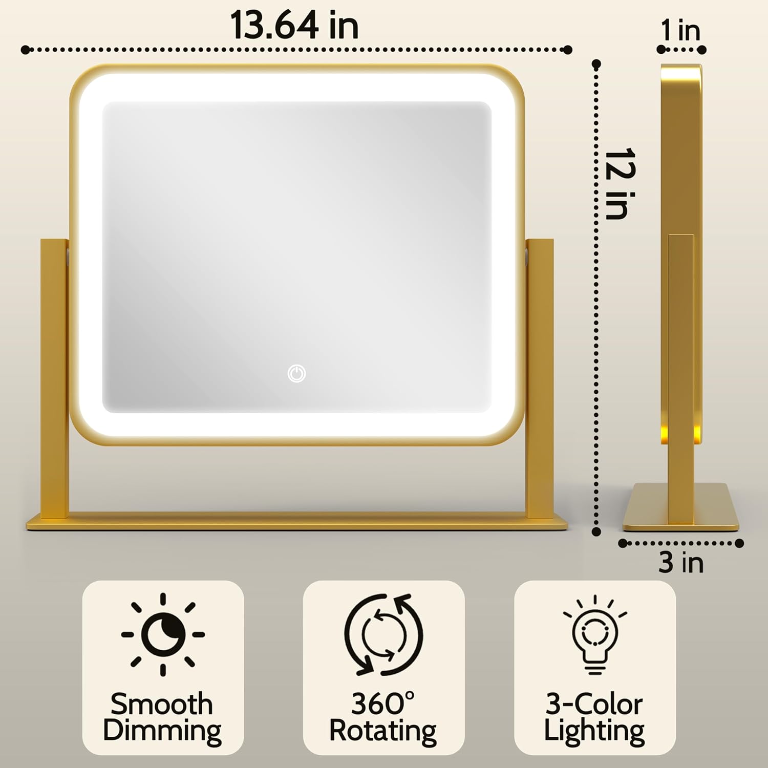 Gold Lighted Makeup Mirror, 14"x12" Vanity Mirror with Smart Touch Control, 3-Color Dimmable Lighting, 360° Rotation for Desk or Bedroom