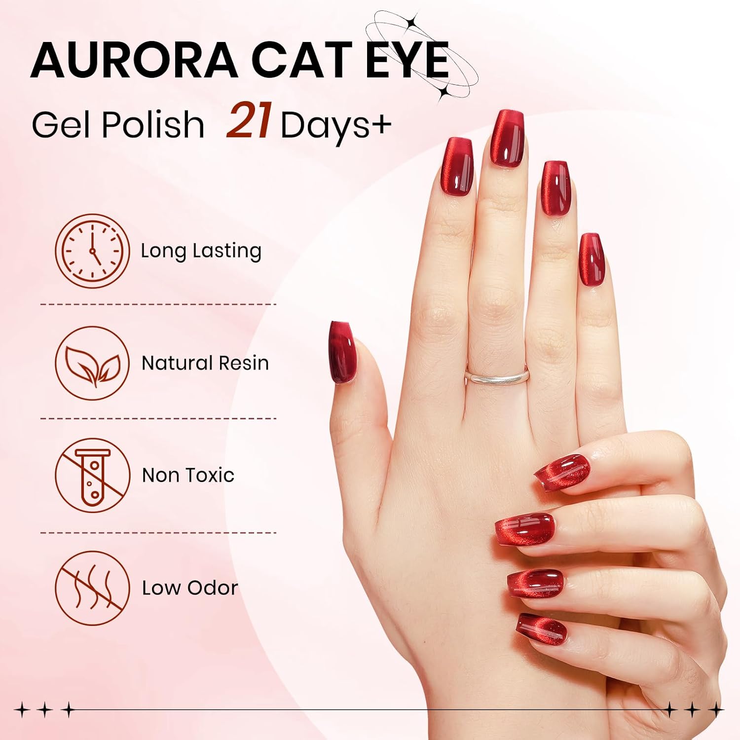 - Smoothie Cat Eye Gel Polish: 1*15ml(0.5fl oz) dark red cat eye gel nail polish with 1PC magnetic stick. Mixed with smoothie magnetic glitter, it's perfect for making a statement
