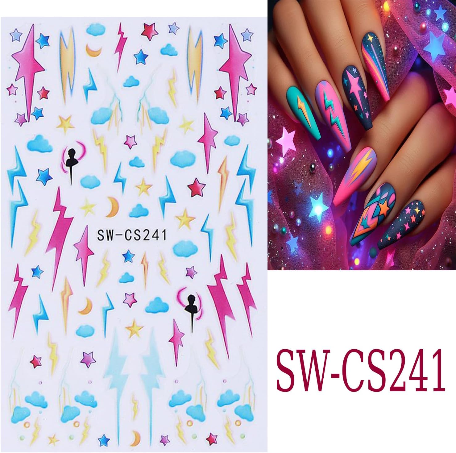 Lightning Nail Art Stickers 3D Self-Adhesive Nails Sticker Colorful Lines Nail Art Decals Holographic Stars Nail Decal Decoration for Women Cute Clouds Manicure Stickers DIY Nails Art Sticker Supplies