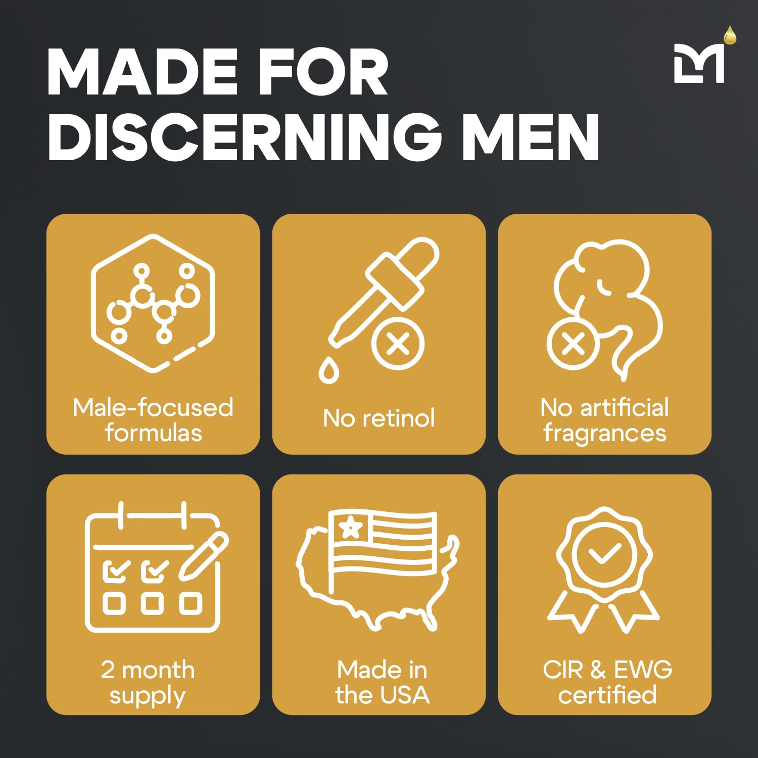 - Higher Standards in Men's Facial Skin Care: All of our men's skin care sets & kits are engineered and made right here in the USA; We made sure every men's skincare set ingredient passes the highest safety standards from both CIR and EWG – the top authorities in men's facial care kit safety