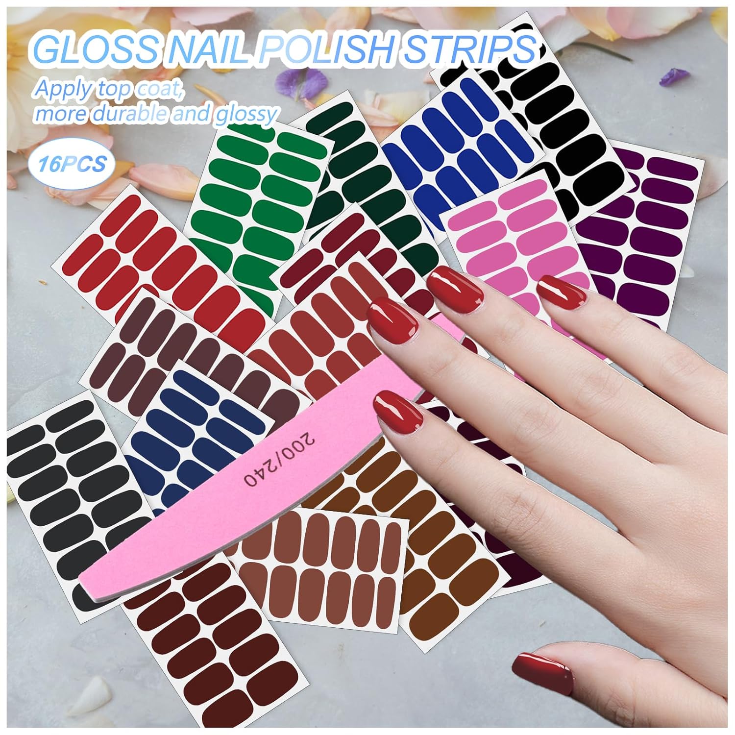 - Package Includes: 16 sheets of nail polish stickers + 1 nail file. Each nail sheet measures approximately 10 x 5.5 cm (4 x 2.2 inches), with a total of 224 pieces across 7 different sizes. With a variety of styles and colors, you'll always have gorgeous nails at your fingertips!