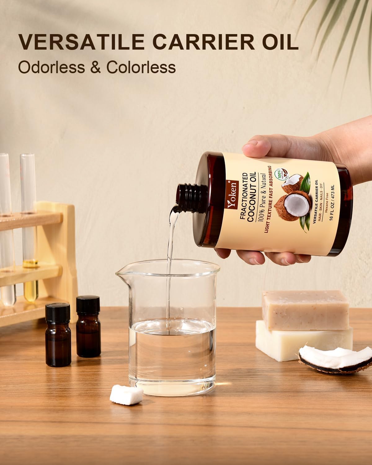 - 100% Pure & Natural: Yoken Fractionated Coconut Oil is rich in MCTs, staying liquid, lightweight, and oxidation-resistant. Pure, odorless, and colorless, it leaves skin soft without greasy residue. Chemicals free, hexane free, and cruelty free.